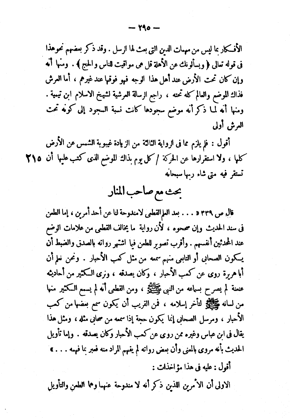 قال ص339 « ... بعد العلم القطعي لا مندوحة لنا عن أحد أمرين، إما الطعن في سند الحديث وإن صححوه، لأن رواية ما يخالف القطعي من علامات الوضع عند المحدثين أنفسهم. وأقرب تصوير للطعن فيما اشتهر رواية بالصدق والضبط أن يكون الصحابي أو التابعي منهم سمعه من مثل كعب الأحبار. ونحن نعلم أن أبا هريرة روى عنه كعب الأحبار، وكان يصدقه، ونرى الكثير من أحاديثه عنعنة لم يصرح بسماعه من البي صلى الله عليه وسلم، ومن القطعي أنه لم يسمع الكثير منها من لسانه صلى الله عليه وسلم لتأخر إسلامه، فمن القريب أن يكون سمع بعضها من كعب الأحبار، ومرسل الصحابي إنما يكون حجة إذا سمعه من صحابي مثله، ومثل هذا يقال في ابن عباس وغيره ممن روى عن كعب الأحبار وكان يصدقه. وإما تأويل الحديث بأنه مروي بالمعنى وأن بعض رواته لم يفهم المراد منه فعبر بما فهمه ... »