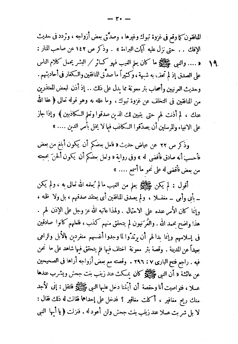 المنافقون كما وقع في غزوة تبوك وغيرها، وصدق بعض أزواجه، وتردد في حديث الإفك.. حتى نزل عليه آيات البراءة» . وذكر ص142 عن صاحب المنار: «.... والنبي صلى الله عليه وسلم ماكان يعلم الغيب فهو كسائر البشر/ يحمل كلام الناس على الصدق إذ لم تحف به شبهة، وكثيراً ما صدق المنافقين والكفار في أحاديثهم. وحديث العرنيين وأصحاب بئر معونة مما يدل على ذلك.. إذ أذن لبعض المعتذرين من المنافقين في التخلف عن غزوة تبوك، وما علله به وهو قوله تعالى (عفا الله عنك، لم أذنت لهم حتى بتبين لك الذين صدقوا وتعلم الكاذبين) وإذا جاز على الأنبياء والمرسلين أن يصدقوا الكاذب فيما لا يخل بأمر الدين ... »