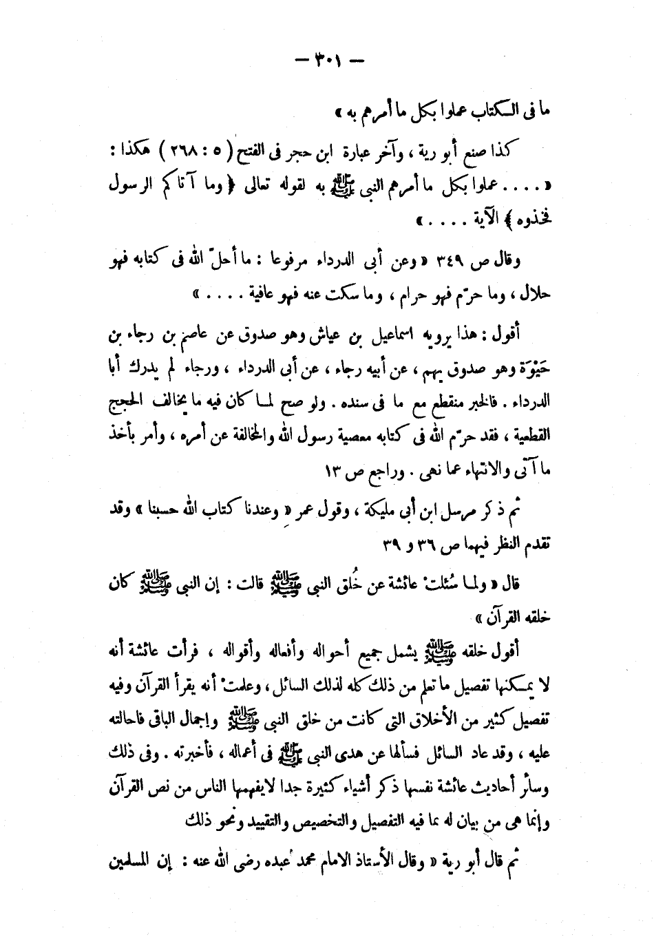 كذا صنع أبو رية، وآخر عبارة ابن حجر في الفتح (5:268) هكذا: « ... عملوا بكل ما أمرهم النبي صلى الله عليه وسلم به لقوله تعالى (وما أتاكم الرسول فخذوه) الآية ... »