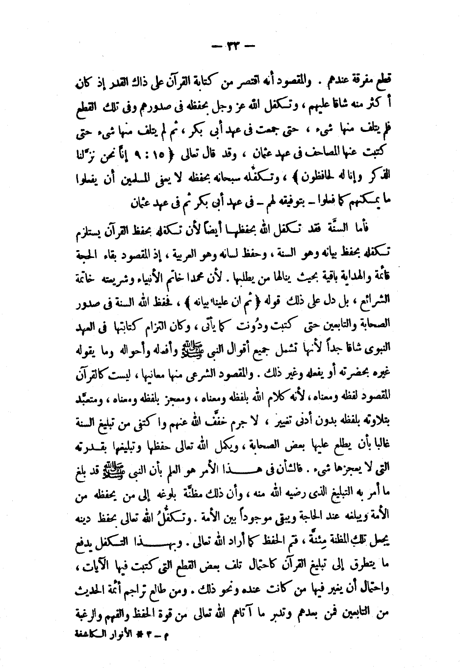 فأما السنة فقد تكفل الله بحفظها أيضا، لأن تكفله بحفظ القرآن يستلزم تكفله بحفظ بيانه وهو السنة، وحفظ لسانه وهو العربية، إذ المقصود بقاء الحجة قائمة والهداية باقية بحيث ينالها من يطلبها، لأن محمداً خاتم الأنبياء وشريعته خاتمة الشرائع. بل دل على ذلك قوله (ثم إن علينا بيانه) ، فحفظ الله السنة في صدور الصحابة والتابعين حتى كتبت ودونت كما يأتي، وكان التزام كتابتها في العهد النبوي شاقاً جداً، لأنها تشمل جميع أقول النبي صلى الله عليه وسلم وأفعاله وأحواله وما يقوله غيره بحضرته أو يفعله وغير ذلك. والمقصود الشرعي منها معانيها، ليست كالقرآن المقصود لفظه ومعاناه، لأن كلام الله بلفظه ومعناه، ومعجز بلفظه ومعناه، ومتعبد بتلاوته بلفظه بدون أدنى تغيير، لاجرم خفف الله عنهم واكتفى من تبليغ السنة غالباً بأن يطلع عليها بعض الصحابة، ويكمل الله تعالى حفظها وتبليغها بقدرته التي لا يعجزها شيء، فالشأن في هذا الأمر هو العلم بأن النبي صلى الله عليه وسلم قد بلغ ما أمر به التبليغ الذي رضيه الله منه، وأن ذلك مظنة بلوغه إلى من يحفظه من الأمة ويبلغه عند الحاجة ويبقى موجوداً بين الأمة، وتكفل الله تعالى بحفظ دينه يجعل تلك المظنة مئنة، فتم الحفظ كما أراد الله تعالى، وبهذا التكفل يدفع ما يتطرق إلى تبليغ القرآن كاحتمال تلف بعض القطع التي كتبت فيها الآيات، واحتمال أن يغير فيها من كانت عنده ونحو ذلك.