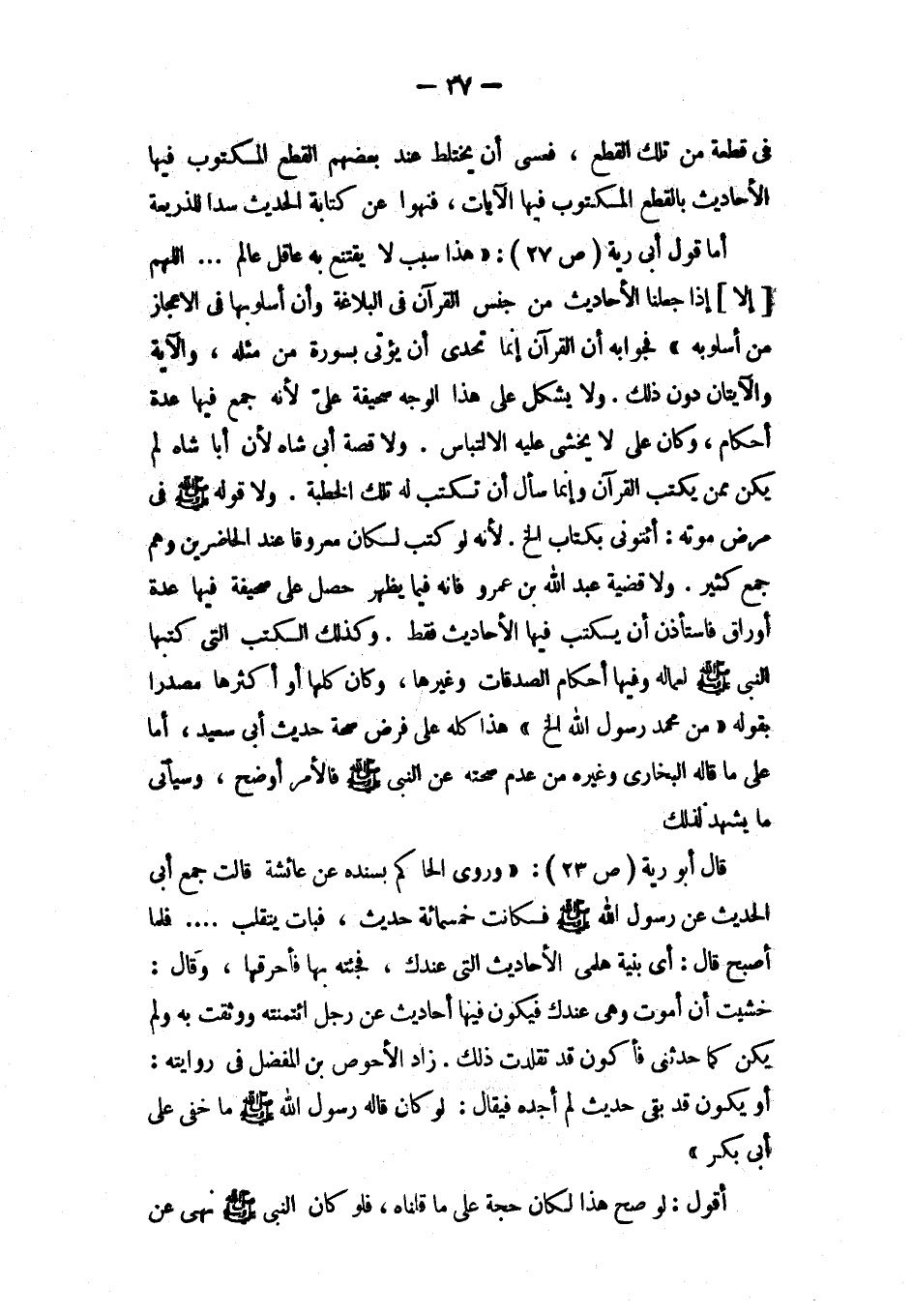 أما قول أبي رية (ص27) : «هذا سبب لا يقتنع به عاقل عالم ... اللهم [إلا] إذا جعلنا الأحاديث من جنس القرآن في البلاغة وأن أسلوبها في الإعجاز من أسلوبه»