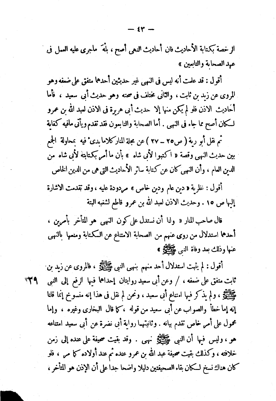 أقول: لم يثبت استدلال أحد منهم بنهي النبي صلى الله عليه وسلم، فالمروى عن زيد بن ثابت متفق على ضعفه، / وعن أبي سعيد روايتان إحداهما فيها الرفع إلى النبي صلى الله عليه وسلم، ولم يذكر فيها امتناع أبي سعيد، ونحن لم نقل في هذا إنه منسوخ إنما قلنا إنها إ ما خطأ والصواب عن أبي سعيد من قوله، كما قال البخاري وغيره، وإما محمول على أمر خاص تقدم بيانه. وثانيتهما رواية أبي نضرة عن أبي سعيد امتناعه هو، وليس فيها أن النبي صلى الله عليه وسلم نهى. وقد بقيت صحيفة علي عنده إلى زمن خلافته، وكذلك بقيت صحيفة عبد الله بن عمرو عنده وعند أولاده كما مر، فلو كان هناك نسخ لكان بقاء الصحيفتين دليلاً واضحاً جداً على أن الإذن هو المتأخر،