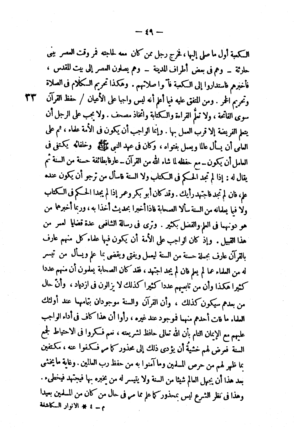 الكعبة أول ما صلى إليها، فخرج ممن كان معه لحاجته فمر وقت العصر ببي حارثة- وهم في بعض أطراف المدينة – وهم يصلون إلى بيت المقدس، فأخبرهم فاستداروا إ لى الكعبة فأتموا صلاتهم. وهكذا تحريم الكلام في الصلاة وتحريم الخمر، ومن المتفق عليه فيما أعلم أنه ليس واجباً على الأعيان / حفظ القرآن سوى الفاتحة، ولا تعلم القراءة والكتابة واتخاذ مصحف، ولايجب على الرجل أن يتعلم الفريضة إلا قرب العلم بها. وإنما الواجب أن يكون في الأمة علماء، ثم على العامي أن يسأل