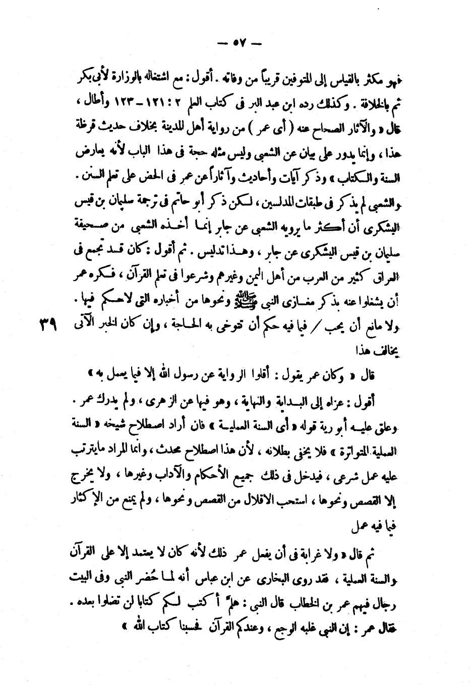 أقول: مع اشتغاله بالوزارة لأبي بكر ثم بالخلافة. وكذلك رده ابن عبد البر في كتاب العلم 121:2-123 وأطال، قال «والآثار الصحاح عنه (أي عمر) من رواية أهل المدينة بخلاف حديث قرظة هذا، وإنما يدل على بيان عن الشعبي وليس مثله حجة في هذا الباب لأنه يعارض السنة والكتاب» وذكر آيات وأحاديث وآثاراً عن عمر في الحض على تعلم السنن، والشعبي لم يذكر في طبقات المدلسين، لكن ذكر أبو حا تم في ترجمة سلميان بن قيس اليشكري أن أكثر ما يرويه الشعبي عن جابر إنما أخذه الشعبي من صحيفة سليمان بن قيس اليشكري عن جابر، وهذا تدليس. ثم أقول: كان قد تجمع في العراق كثير من العرب من أهل اليمن وغيرهم وشرعوا في تعلم القرآن، فكره عمر أن يشغلوا عنه بذكر مغازى النبي صلى الله عليه وسلم ونحوها من أخباره التي لا حكم فيها. ولا مانع أن يجب / فيما فيه حكم أن تتوخى به الحاجة، وإن كان الخبر الآتي يخالف هذا.