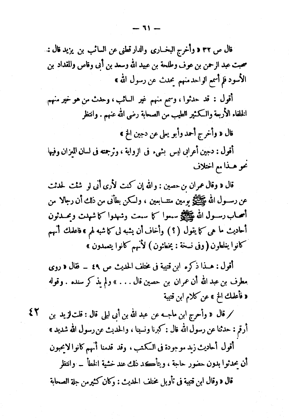 قال ص 32 «وأخرج البخاري والدارقطني عن السائب بن يزيد قال: صحبت عبد الرحمن بن عوف وطلحة بن عبيد الله وسعد بن أبي وقاص والمقداد بن الأسود فلم أسمع الواحد منهم يحدث عن رسول الله» .