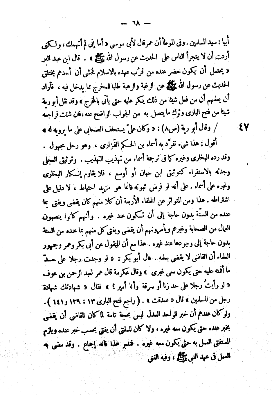 /وقال أبو رية (ص8) : «وكان علي يستحلف الصحابي على ما يرويه له» وقد رده البخاري وغيره كما في ترجمة أسماء من تهذيب التهذيب. وتوقيق العجلي وجدته بالاستقراء، كتوثيق ابن حبان أو أوسع، فلا يقاوم إنكار البخاري وغيره على أسماء. على أنه لو فرض ثبوته فإنما هو مزيد الاحتياط، لا دليل على اشتراطه. هذا من المتواتر عن الخلفاء الأربعة أن كلا منهم كان يقضي ويفتي بما عنده من السنة بدون حاجة إلى أن تكون عند غيره. وأنهم كان ينصبون العمال من الصحابة وغيرهم ويأمرونهم أن يقضي ويفتي كل منهم بما عنده من السنة بدون حاجة إلى وجودها عند غيره. هذا مع أن المنقول عن أبي بكر وعمر وجمهور العلماء أن القاضي لا يقضي بعلمه. وقال أبو بكر «لو وجدت رجلاً على حد ما أقمته عليه حتى يكون معي غيري» وقال عكرمة: قال عمر لعبد الرحمن بن عوف «لو رأيت رجلاً على حد زنا أو سرقة وأنا أمير؟» فقال «شهادتك شهادة رجل من المسلمين» قال: «صدقت» . (راجع فتح الباري 139:13و141) . ولوكان عندهم أن خبر الواحد العدل ليس بحجة تامة لما كان للقاضي أن يقضي بخبر عنده حتى يكون معه غيره، ولا كان للمفتي أن يفتي بحسب خبر عنده ويلزم المستفتي العمل به حتى يكون معه غيره. فتدبر هذا فإنه إجماع. وقد مضي به العمل في عهد النبي صلى الله عليه وسلم، وفيه الغنى.