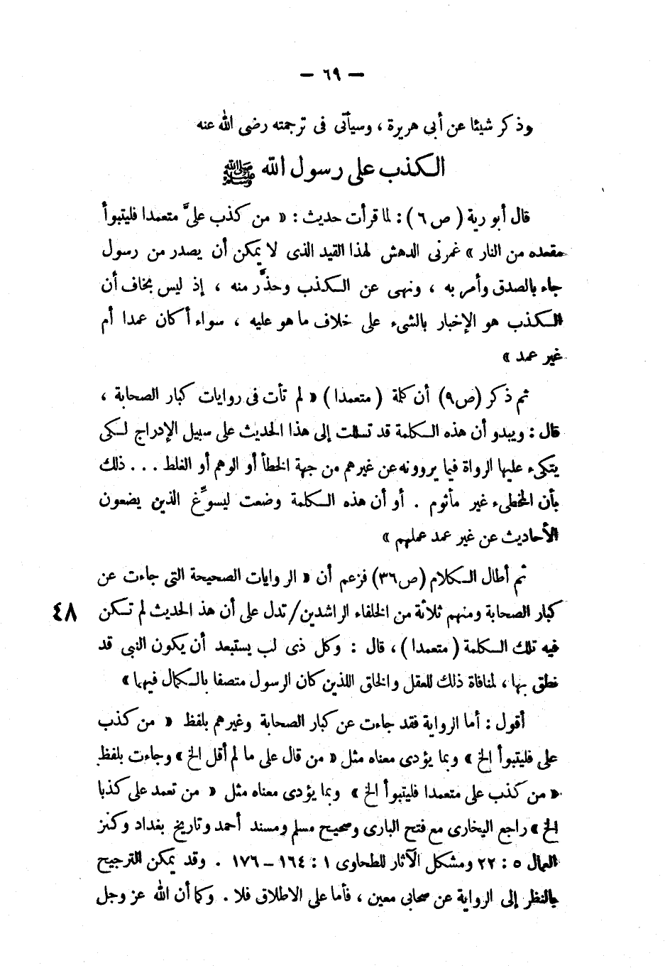 أقول: أما الرواية فقد جاءت عن كبار الصحابة وغيرهم بلفظ «من كذب على فلبيتبوأ الخ» وبما يؤدي معناه مثل «من قال علي ما ألم أقل الخ» وجاءت بلفظ «من كذب علي متعمداً فليتبوأ الخ» وبما يؤدي معناه مثل «من تعمد علي كذبا الخ» راجع البخاري من فتح الباري وصحيح مسلم ومسند أحمد وتاريخ بغداد وكنز العمال 22:5 ومشكل الآثار للطحاوي 164:1-176. وقد يمكن للترجيح بالنظر إلى الرواية عن صحابي معين، فأما على الاطلاق فلا، وكما أن الله عز وجل