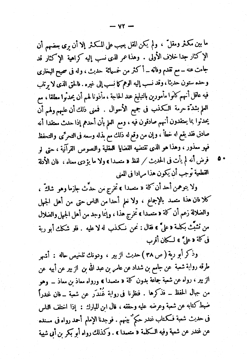 ولا يتوهمن أحد أن كلمة متعمداً تخرج من حدث جازماً وهو شاك، كلا فإن هذا متعمد بالإجماع، ولا نعلم أحد من الناس حتى من أهل الجهل والضلالة زعم أن كلمة «متعمداً» تخرج هذا، وإنما وجد من أهل الجهل والضلال من تشبت بكلمة «علي» فقال: نحن نكذب له لا عليه. فلو شكك أبو رية في كلمة «علي» لكان أقرب