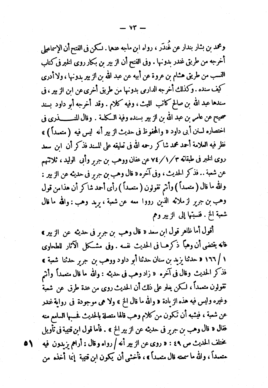 ومحمد بن بشار بندار عن غندر، وراه ابن ماجه عنهما، لكن في الفتح أن الإسماعيلي أخرجه من طريق غندر بدونها. وفي الفتح أن الزبير بن بكار روى الخبر في كتاب النسب من طريق هشام بن عروة عن أبيه عن عبد الله بن الزبير بدونها، ولا أدري كيف سنده. وكذلك أخرجه الدارمي بدونها من طريق أخرى عن ابن الزبير، في سندها عبد الله بن صالح كاتب الليث، وفيه كلام. وقد أخرجه أبو داد بسند صحيح عن عامر بن عبد الله بن الزبير بسنده وفيه الكلمة. وقال المنذري في اختصاره لسنن أبي داود «والمحفوظ في حديث الزبير أنه ليس فيه (متعمداً) » نظر فيه العلامة أحمد محمد شاكر رحمه الله في تعليقه على المسند فذكر أن ابن سعد روى الخبر في طبقاته 3/1/ 74 عن عفان ووهب بن جرير وأبي الوليد، ثلاثتهم عن شعبة. فذكر الحديث وفي أخره «قال وهب بن جرير في حديثه عن الزبير: والله ما قال «متعمداً» وأنتم تقولون «متعمداً» رأى أحمد شاكر أن هذا من قول وهب بن جرير لزملائه الذين رووا معه عن شعبة، يريد وهب: والله ما قال شعبة الخ:. فنسبتها إلى الزبير وهم.