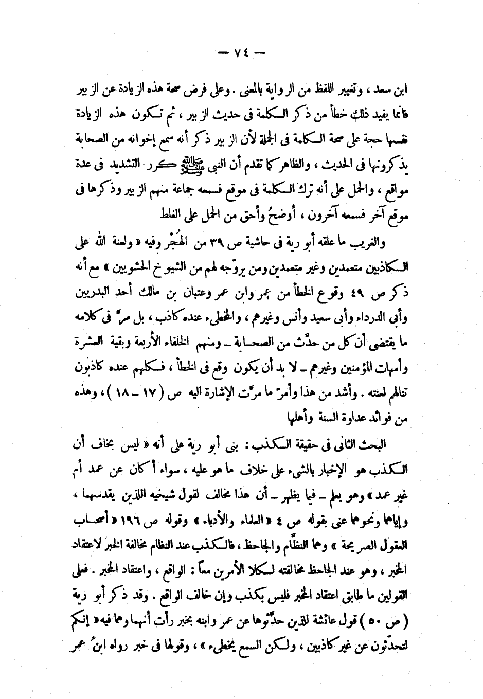 البحث الثاني في حقيقة الكذب: بنى أبو رية على أنه «ليس بخاف أن الكذب هوا لإخبار بالشيء علىخلاف ما هو عليه، سواء أكا ن عن عمد أم غير عمد» وهو يعلم - فيما يظهر - أن هذا مخالف لقول شيخيه اللذين يقدسهما، وإيهاما ونحوهما عنى بقوله ص4 «العلماء والأدباء» وقوله ص196 «أصحاب العقول الصريحة» وهما النظام والجاحظ، فالكذب عند النظام مخالفة الخبر لاعتقاد المخبر، وهو عند الجاحظ مخالفته لكلا الأمرين معاً: الواقع، واعتقاد الخبر، فعلى القولين ما طابق اعتقاد المخبر فليس بكذب وإن خالف الواقع. وقد ذكر أبو رية (ص50) قول عائشة الذين حدثوها عن عمر وابنه بخبر رأت أنهما وهما فيه «إنكم لتحدثون عن غير كاذبين، ولكن السمع يخطيء» ، وقولها في خبر رواه ابن عمر