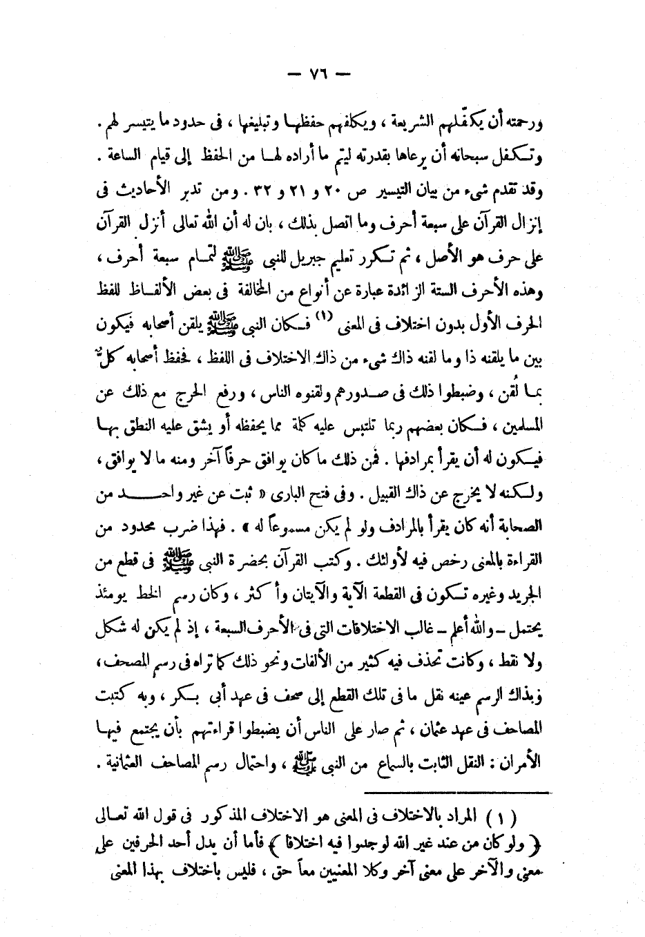 (1) المراد بالاختلاف في المعنى هو الاختلاف المذكور في قول الله تعالى ((ولو كان من عند غير الله لوجدوا فيه اختلافا)) فأما أن يدل أحد الحرفين على معنى والآخر على معنى آخر وكلا المعنيين معاً حق. فليس باختلاف بهذا المعنى