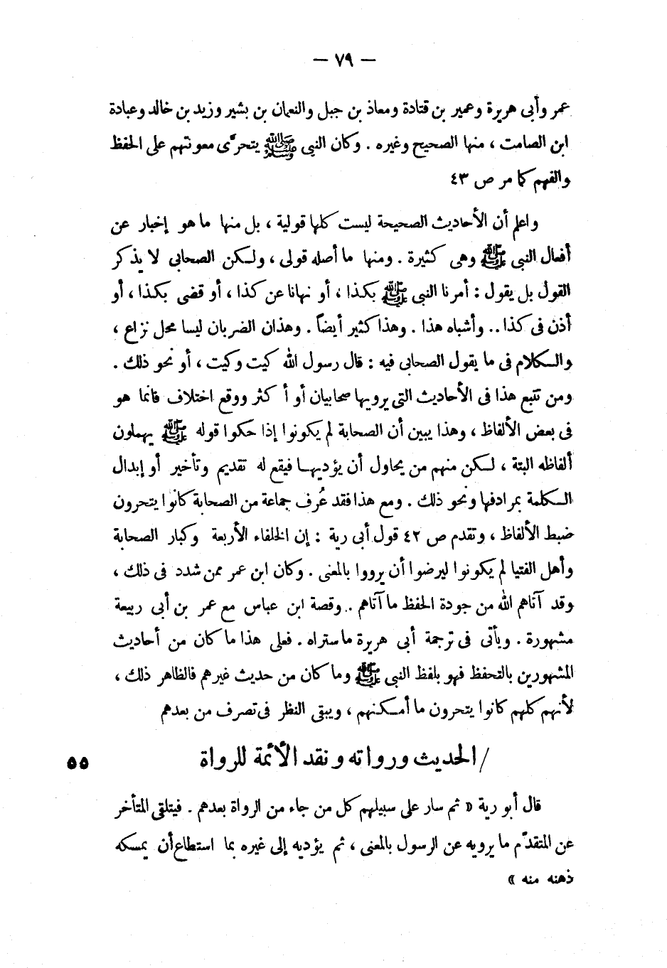 واعلم أن الأحاديث الصحيحة ليست كلها قولية، بل منها ما هو إخبار عن أفعال النبي صلى الله عليه وسلم وهي كثيرة. ومنها ما أصله قولي، ولكن الصحابي لا يذكر القول بل يقول: أمرنا النبي صلى الله عليه وسلم بكذا، أو نهانا عن كذا، أو قضى بكذا، أو أذن في كذا.. وأشباه هذا. وهذا كثير أيضاً. وهذان الضربان ليسا محل نزاع، والكلام في مايقول الصحابي فيه: قال رسول الله كيت وكيت، أو نحو ذلك. ومن تتبع هذا في الأحاديث التي يرويها صحابيان أو أكثر ووقع اختلاف فإنما هو في بعض الألفاظ، وهذا يبين أن الصحابة لم يكونوا إذا حكوا قوله صلى الله عليه وسلم يهملون ألفاظه البتة، لكن منهم من يحاول أن يؤديها فيقع له تقديم وتأخير أو إبدال الكلمة بمرادفها ونحو ذلك. ومع هذا فقد عرف جماعة من الصحابة كانوا يتحرون ضبط الألفاظ، وتقدم ص42 قول أبو رية: إن الخلفاء الأربعة وكبار الصحابة وأهل الفتيا لم يكونوا ليرضوا أن يرووا بالمعنى. وكان ابن عمر ممن شدد في ذلك، وقد آتاهم الله من جودة الحفظ ما آتاهم. وقصة ابن عباس مع عمر بن أبي ربيعة مشهورة. ويأتي في ترجمة أبي هريرة ما ستراه، فعلى هذا ما كان من أحاديث المشهورين بالتحفظ فهو بلفظ النبي صلى الله عليه وسلم وما كان من حديث غيرهم فالظاهر ذلك، لأنهم كلهم كانوا يتحرون ما أمكنهم، ويبقى النظر في تصرف من بعدهم.