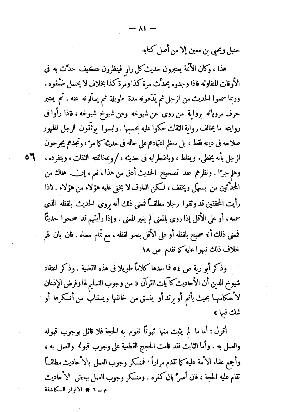 هذا، وكان الأئمة يعتبرون حديث كل راو فينظرون كيف حدث به في الأوقات المتفاوته فإذا وجدوه يحدث مرة كذا ومرة كذا بخلاف لا يحتمل ضعفوه. وربما سمعوا الحديث من الرجل ثم يدعونه مدة طويلة ثم يسألونه عنه. ثم يعتبر حرف مرواياته برواية من روى عن شيوخه وعن شيوخ شيوخه، فإذا رأوا في روايته مايخالف رواية الثقات حكموا عليه بحسبها. وليسوا يوثقون الرجل لظهور صلاحه في دينه فقط.، بل معظم اعتمادهم علىحاله في حديثه كما مر، وتجدهم يجرحون الرجل بأنه يخطيء ويغلط، وباضطرابه في حديثه، / وبمخالفته الثقات، وبتفرده، وهلم جرا. ونظرهم عند تصحيح الحديث أدق من هذا، نعم، إن هناك من المحدثين من يسهل ويخفف، لكن العارف لا يخفى عليه هؤلاء من هؤلاء. فإذا رأيت المحققين قد وثقوا رجلاً مطلقاً فمعنى ذلك أنه يروي الحديث بلفظه الذي سمعه، أو على الأقل إذا روى المعنى لم يغير المعنى، وإذا رأيتهم قد صححوا حديثاً فمعنى ذلك أنه صحيح بلفظه أو على الأقل بنحو لفظه، مع تمام معناه، فإن بان لهم خلاف ذلك نبهوا عليه كما تقدم ص18.