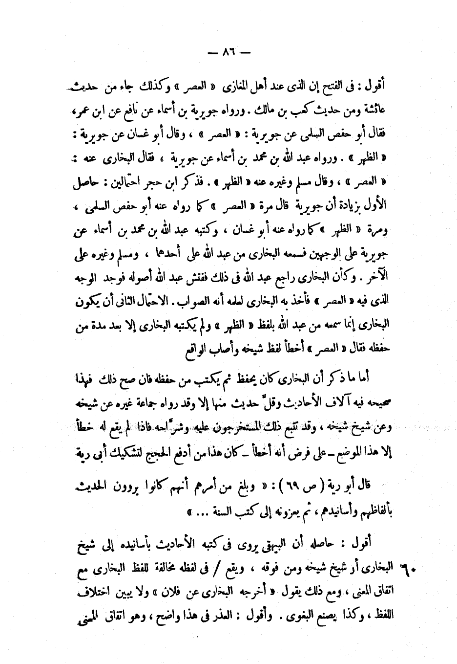 أقول: في الفتح إن الذي عند أهل المغازي «العصر» وكذلك جاء من حديث عائشةومن حديث كعب بن مالك. ووراه جويرية بن أسماء عن نافع عن ابن عمر، قال أبو حفص السلمي عن جويرية: «العصر» وقال أبو غسان عن جويرية: «الظهر» . ورواه أبو عبد الله بن محمد بن أسماء عن جويرية، فقال البخاري عنه: العصر وقال مسلم وغيره عنه: الظهر فذكر ابن حجر احتمالين: حاصل الأول بزيادة أن جويرية قال مرة «العصر» كما رواه أبو حفص السلمي، ومرة «الظهر» كما رواه عنه أبو غسان، وكتبه عبد الله بن محمد بن أسماء عن جويرية على الوجهين فسمعه البخاري من عبد الله على أحدهما، ومسلم وغيره على الآخر. وكأن البخاري راجع عبد الله في ذلك ففتش عبد الله أصوله فوجد الوجه الذي فيه العصر فأخذ به البخاري لعلمه أنه الصواب. الاحتمال الثاني أن يكون البخاري إنما سمعه من عبد الله بلفظ «الظهر» ولم يكتبه البخاري إلا بعد مدة من حفظه «العصر» أخطأ لفظ شيخه وأصاب الواقع