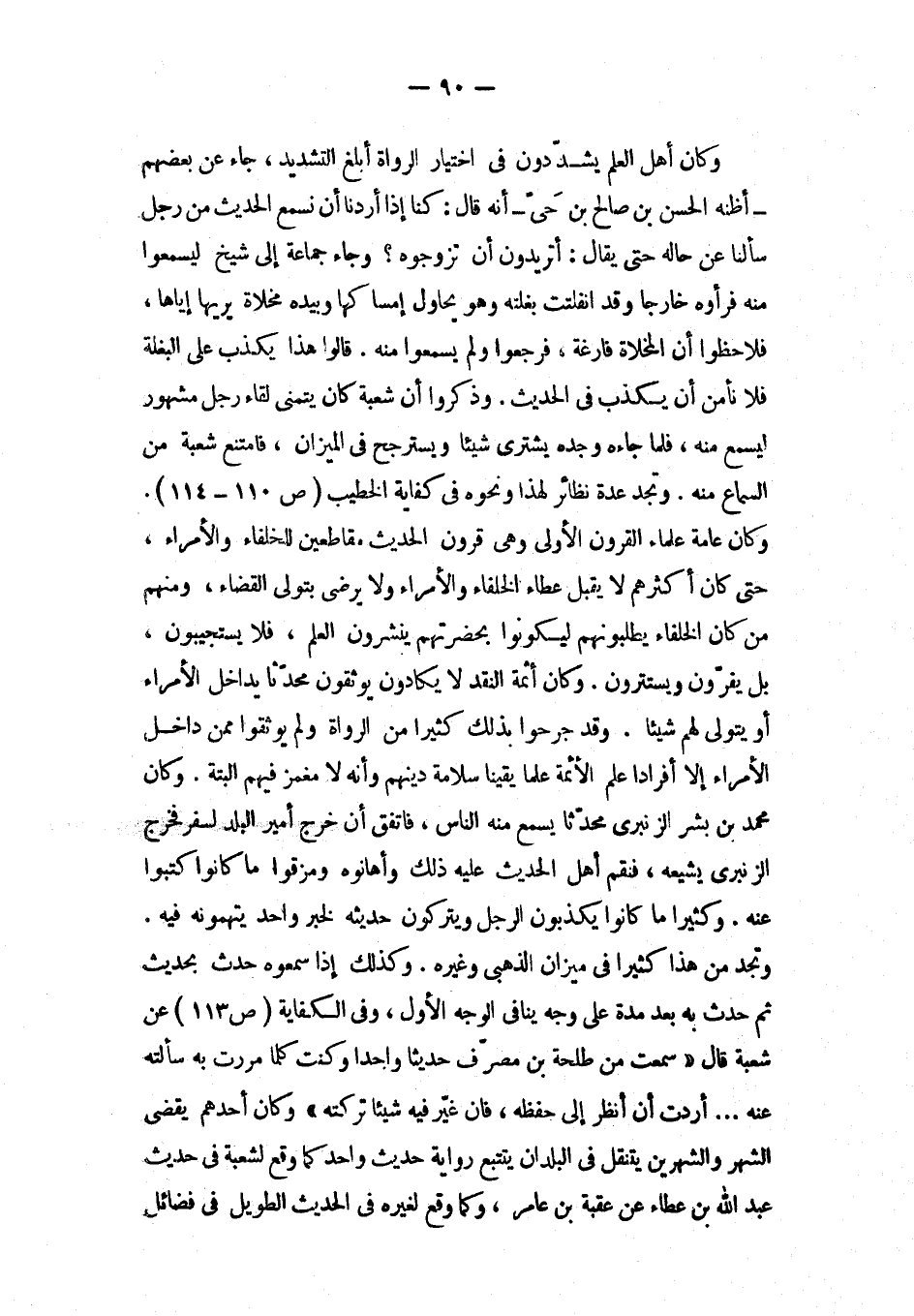 وكان أهل العلم يشددون في اختيار الرواة أبلغ التشديد، جاء عن بعضهم - أظنه الحسن بن صالح بن حي- أنه قال: كنا إذا أردنا أن نسمع الحديث من رجل سألنا عن حاله حتى يقال: أتريدون أن تزوجوه؟ وجاء جماعة إلى شيخ ليسمعوا منه فرأوه خارجاً وقد انفلتت بغلته وهو يحاول إمساكها وبيده مخلاة يريها إياها، فلاحظوا أن المخلاة فارغة، فرجعوا ولم ييسمعوا منه. قالوا هذا يكذب على البغلة فلا نأمن أن يكذب في الحديث. وذكروا أن شعبة كان يتمنى لقاء رجل مشهور ليسمع منه. فلما جاءه وجده يشتري شيئاً ويسترجح في الميزان. فامتنع شعبة من السماع منه. وتجد عدة نظائر لهذا ونحوه في كفاية الخطيب (ص110-114) .وكان عامة علماء القرون الأولى وهي قرون الحديث مقاطين للخلفاء والأمراء، حتى كان أكثرهم لا يقبل عطاء الخلفاء والأمراء ولا يرضى بتولي القضاء، ومنهم من كان الخلفاء يتطلبونهم ليكونوا بحضرتهم ينشرون العلم. فلا يستجيبون، بل يفرون ويستترون. وكان أئمة النقد لا يكادون يوثقون محدثاً يداخل الأمراء أو يتولى لهم شيئاً، وقد جرحوا بذلك كثيراً من الرواة ولم يوثقوا ممن داخل الأمراء إلا أفراد علم الأئمة يقيناً سلامة دينهم وأنه لا مغمز فيهم البتة. وكان محمد بن بشر الزنبري محدثاً يسمع منه الناس، فاتفق أن خرج أمير البلد لسفر فخرج الزنبري يشيعه، فنقم أهل الحديث عليه ذلك وأهانوه ومزقوا ما كان كتبوا عنه. وكثيراً ما كانوا يكذبون الرجل ويتركون حديثه لخبر واحد يتهمون فيه. وتجد من هذا كثيراً في ميزان الذهبي وغيره. وكذلك إذا سمعوه حدث بحديث ثم حدث به بعد مدة علىوجه ينافي الوجه الأول، وفي الكفاية (ص113) عن شعبة قال «سمعت من طلحة بن مصرف حديثاً واحداً وكنت كلما مررت به سألته عنه.. أردت أن أنظر إلى حفظه، فإن غير فيه شيئاً تركته» وكان أحدهم يقضي الشهر والشهرين يتنقل في البدلان يتتبع رواية حديث واحد كما وقع لشعبة في حديث عبد الله بن عطاء عن عقبة بن عامر، وكما وقع لغيره في الحديث الطويل في فضائل