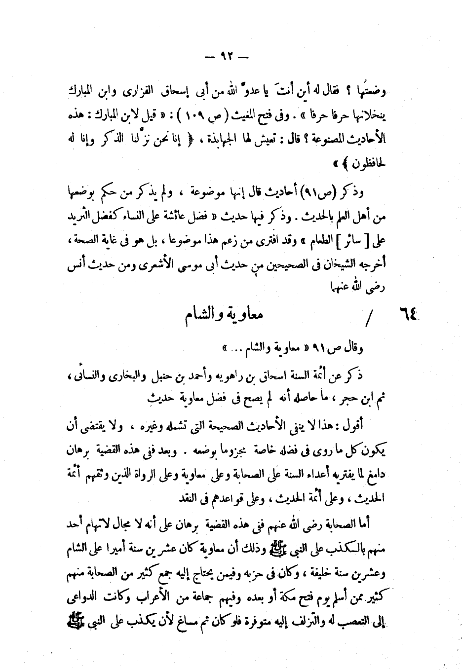 أقول: هذا لا ينفي الأحاديث الصحيحة التي تشمله وغيره، ولا يقتضى أن يكون كل ما روي في فضله خاصة مجزوماً بوضعه. وبعد ففي القضية برهان دامغ لما يفتريه أعداء السنة على الصحابة وعلى معاوية وعلى الرواة الذين وثقهم أئمة الحديث، وعلى أئمة الحديث، وعلى قواعدهم في النقد.