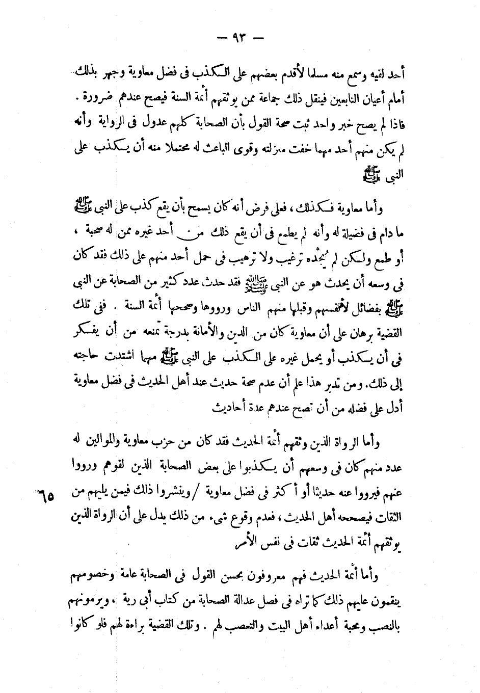 وأما الرواة الذين وثقهم أئمة الحديث فقد كان من حزب معاوية والموالين له عدد منهم كان في وسعهم أن يكذبوا على بعض الصحابة الذين لقوهم ورووا عنهم فيرووا عنه حديثاً أو أكثر في فضل معاوية / وينشروا ذلك فيمن يليهم من الثقات فيصححه أهل الحديث فعدم وقوع شيء من ذلك يدل على أن الرواة الذين يوثقهم أئمة الحديث ثقات في نفس الأمر
