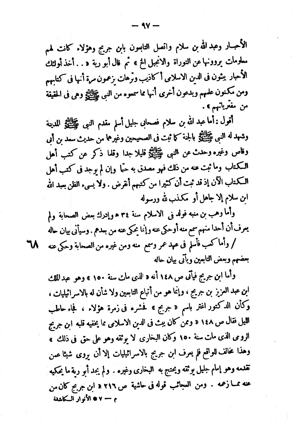 أقول: أما عبد الله بن سلام فصحابي جليل أسلم مقدم النبي صلى الله عليه وسلم المدينة وشهد له النبي صلى الله عليه وسلم بالجنة كما ثبت في الصحيحين وغيرهما من حديث سعد بن أبي وقاص وغيره وحدث عن النبي صلى الله عليه وسلم قليلاً جداً وقلماذكر عن كتب أهل الكتاب وما ثبت عنه من ذلك فهو مصدق به حتماً وإن لم يوجد في كتب أهل الكتاب الآن إذ قد ثبت أن كثيرا ً من كتبهم أنقرض. ولا يسئ الظن بعبد الله بن سلام إلا جاهل أو مكذب لله ورسوله.