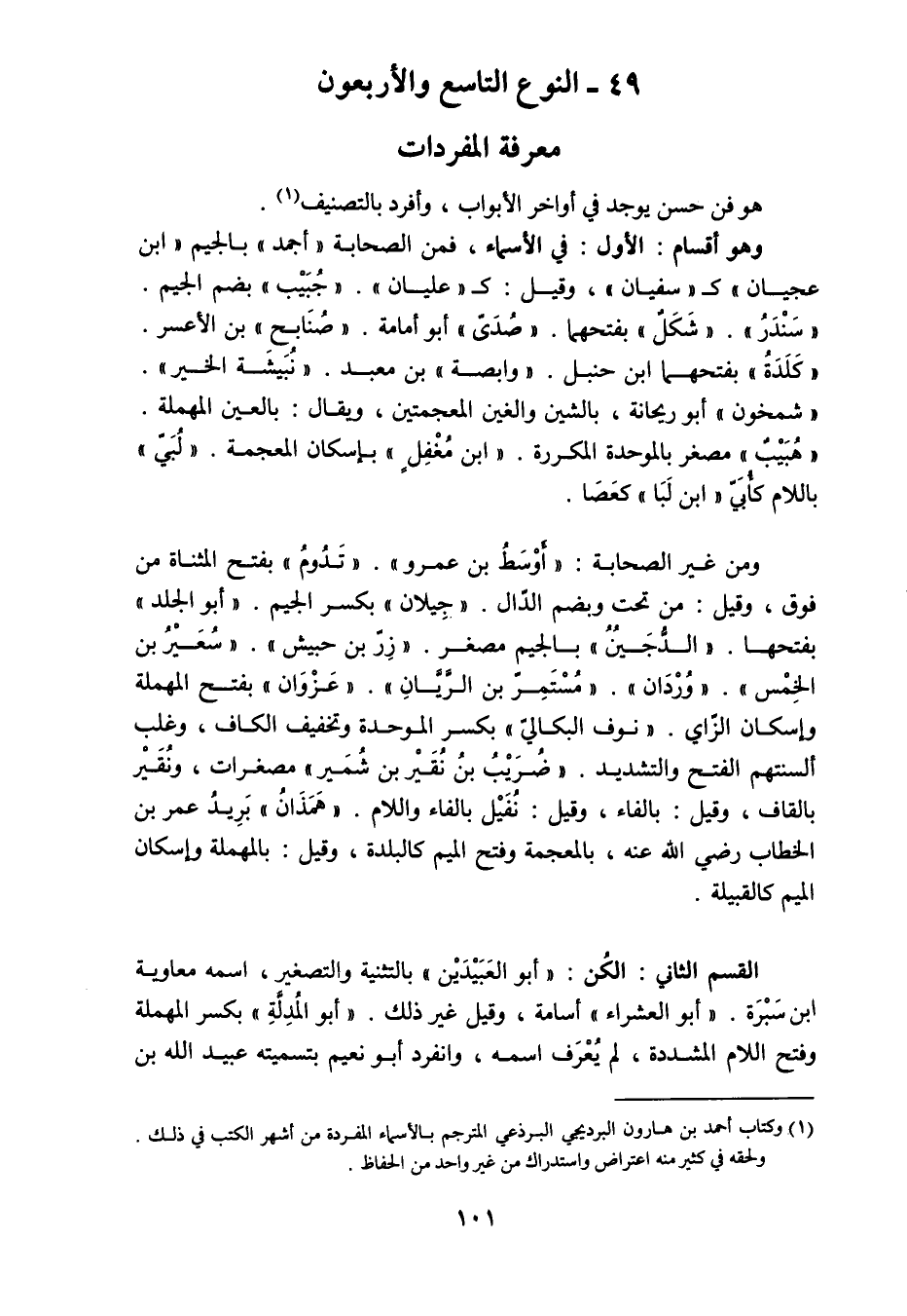 فمن الصحابة: " أجمد " بالجيم بن عجيان كسفيان وقيل: كعليان، " جبيب " بضم الجيم سندر، " شكل " بفتحهما، " صدى " أبو أمامة، " صنابح " ابن الأعسر " كلدة " بفتحهما ابن حنبل " وابصة " ابن معبد " نبيشة الخير " " شمغون " أبو ريحانة بالشين والغين المعجمتين ويقال: بالعين المهملة، " هبيب " مصغر بالموحدة المكررة " ابن مغفل " بإسكان المعجمة " لُبي " باللام كأبي بن لبا كعصا، ومن غير الصحابة: " أوسط بن عمرو " " تدوم " بفتح المثناة من فوق وقيل من تحت وبضم الدال، " جيلان " بكسر الجيم " أبو الجلد " بفتحها " الدجين " بالجيم مصغر، " زر بن حبيش "، " سعير بن الخمس " " وردان "، " مستمر بن الريان " " عزوان " بفتح المهملة وإسكان الزاي " نوف البكالي " بكسر الموحدة وتخفيف الكاف وغلب على ألسنتهم الفتح والتشديد،، " ضريب بن نقير بن سمير " مصغرات، ونقير: بالقاف، وقيل بالفاء، وقيل نفيل بالفاء واللام، " همذان " بريد عمر بن الخطاب رضي الله عنه بالمعجمة وفتح الميم كالبلدة، وقيل: بالمهملة وإسكان الميم كالقبيلة.