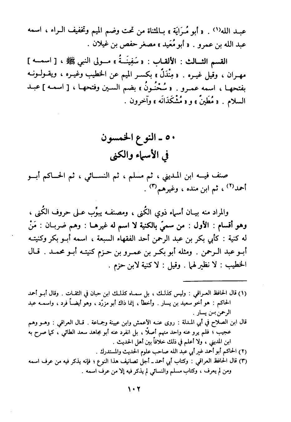 وهم ضربان، منله كنية كأبي بكر بن عبد الرحمن أحد الفقهاء السبعة اسمه أبو بكر وكنيته أبو عبد الرحمن، ومثله أبو بكر بن محمد بن عمرو بن حزم كنيته أبو محمد، قال الخطيب: لا نظير لهما. وقيل: لا كنية لابن حزم.