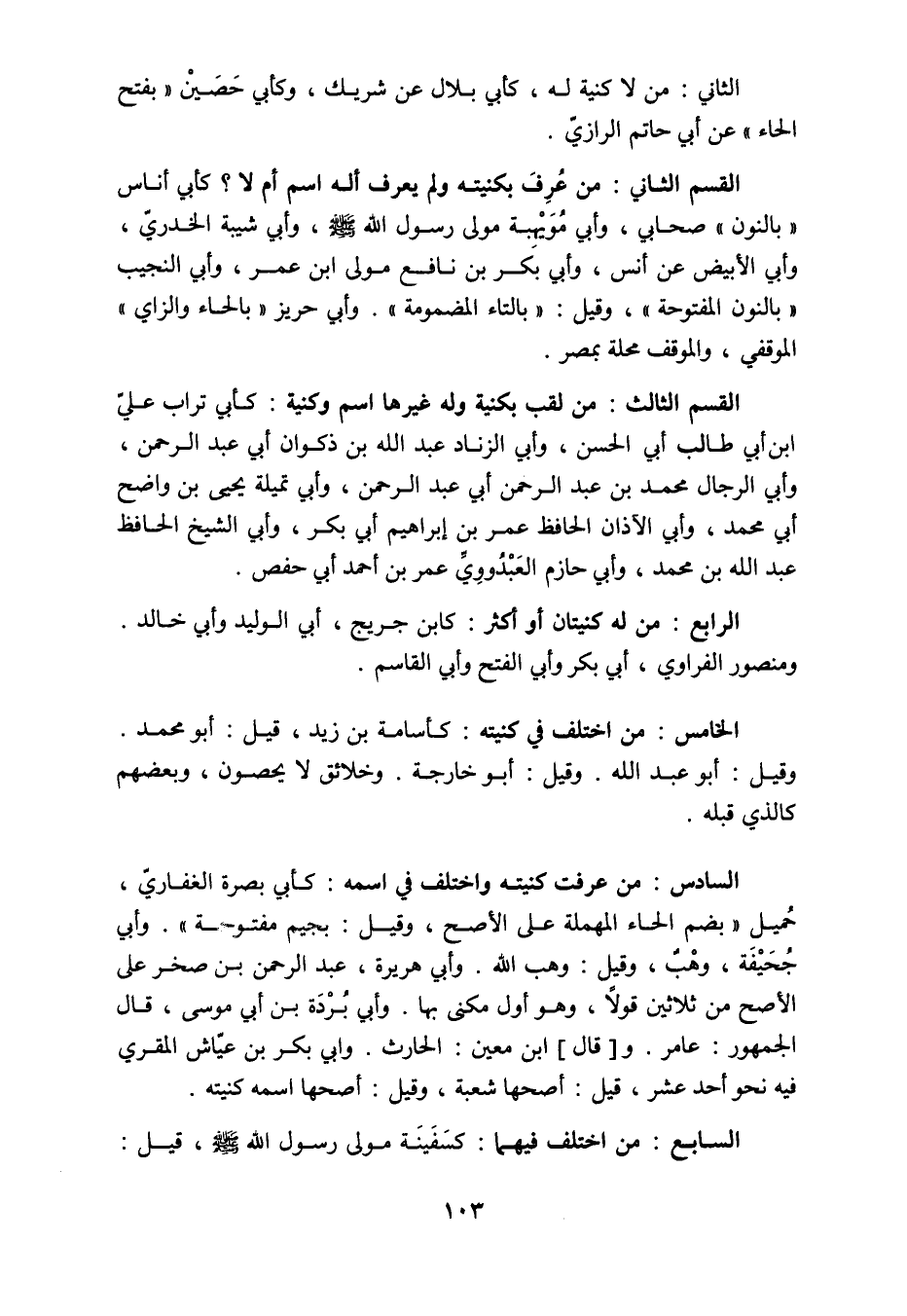 كأبي بصرة الغفاري، حميل بضم الحاء المهملة على الأصح، وقيل بجيم مفتوحة، وأبي جحيفة وهب، وقيل وهب الله، وأبي هريرة، عبد الرحمن بن صخر على الأصح من ثلاثين قولاً، وهو أول مكنى بها، وأبي بردة بن أبي موسى، قال الجمهور: عامر. وابن معين: الحارث، وأبي بكر بن عياش المقري فيه نحو أحد عشر، قيل: أصحها شعبة، وقيل: أصحها اسمه كنيته.
