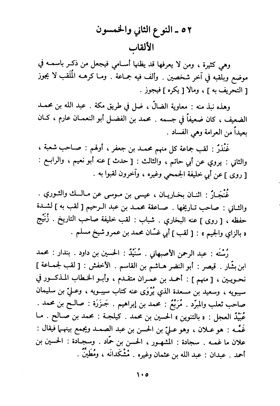 وهي كثيرة ومن لا يعرفها قد يضنها أسامي، فيجعل من ذكر باسمه في موضع وبقلبه في آخر شخصين، وألف فيه جماعة، وما كرهه الملقب لا يجوز وما لا فيجوز، وهذه نبذة منه. معاوية الضال: ذل في طريق مكة، عبد الله بن محمد الضعيف: كان ضعيفاً في جسمه، محمد بن الفضل أبو النعمان عارم: كان بعيداً من العرامة وهي الفساد، غندر: لقب جماعة كل منهم محمد بن جعفر، أولهم محمد بن جعفر صاحب شعبة، والثاني يروي عن أبي حاتم، والثالث عنه أبو نعيم، والرابع عن أبي خليفة الجمحي وغيره، وآخرون لقبوا به، غنجار: اثنان بخاريان، عيسى بن موسى عن مالك والثوري، والثاني صاحب تاريخها، صاعقة: محمد بن عبد الرحيم: لشدة حفظه، عنه البخاري، شباب: لقب خليفة صاحب التاريخ، زنيج، بالزاي والجيم، أبو غسان: محمد بن عمرو شيخ مسلم، رسته: عبد الرحمن الأصبهاني، سنيد: الحسين بن داود، بندار: محمد بن بشار، قيصر: أبو النضر هاشم بن القاسم، الأخفش: نحويون، أحمد بن عمران: متقدم، وأبو الخطاب المذكور في سيبويه، وسعيد بن مسعدة الذي يروي عنه كتاب سيبويه وعلي بن سليمان صاحب ثعلب والمُبَرِّد، مربع: محمد بن إبراهيم، جزرة: صالح بن محمد، عبيد العجل " بالتنوين " الحسين بن محمد، كليجة: محمد بن صالح، ما غمه: هو علان، وهو علي بن الحسن بن عبد الصمد، ويجمع بينهما فيقال: علان ما غمه، سجادة: المشهور الحسن بن حماد، وسجادة الحسين بن أحمد، عبدان الله: عبد الله بن عثمان، وغيره، مشكدانة، ومطين، والله أعلم.