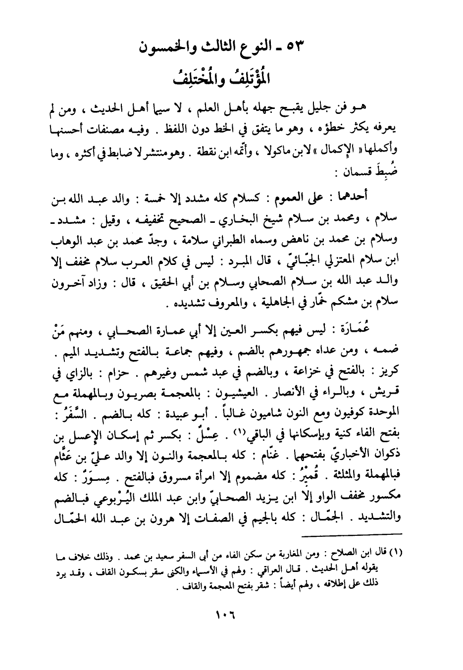 القسم الأول: على العموم كسلاّم كله مشدد إلا خمسة: والد عبد الله بن سلام، ومحمد بن سلام شيخ البخاري، الصحيح تخفيفه، وقيل: مشدد، وسلام بن محمد بن ناهض، وسماه الطبراني سلامة وجد محمد بن عبد الوهاب بن سلام المعتزلي الجبائي، قال المبرد: ليس في كلام العرب سلام مخفف إلا والد عبد الله الصحابي، وسلام بن أبي الحقيق، قال: وزاد آخرون سلام بن مشكم خمار في الجاهلية والمعروفة تشديده، عمارة ليس فيهم بكسر العين إلا أبي بن عمارة الصحابي، ومنهم من ضمه، ومن عداه جمهورهم بالضم، وفيهم جماعة بالفتح وتشديد الميم، " كريز " بالفتح في خزاعة وبالضم في عبد شمس وغيرهم " حزام " بالزاي في قريش وبالراء في الأنصار " العيشيون " بالمعجمة بصريون وبالمهملة مع الموحدة كوفيون ومع النون شاميون غالباً " أبو عبيدة " كله بالضم " السفر " بفتح الفاء كنية وبإسكانها في الباقي " عسل " بكسر ثم إسكان إلا عسل بن ذكوان الأخباري فبفتحهما " غنام " كله بالمعجمة والنون إلا والد علي بن عثام فبالمهملة والمثلثة " قمير " كله مضموم إلا امرأة مسروق فبالفتح " مسور " كله مكسور مخفف الواو إلا ابن يزيد الصحابي، وابن عبد الملك اليربوعي فبالضم والتشديد، " الجمال " كله بالجيم في الصفات إلا هرون بن عبد الله الحمال