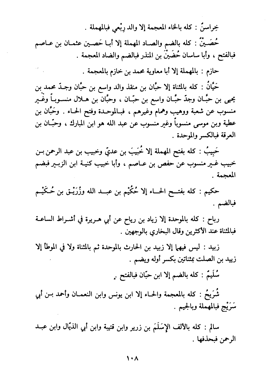" خراش " كله بالخاء المعجمة إلا والد ربعي فبالمهملة " حصين " كله بالضم والصاد المهملة إلا أبا حصين عثمان بن عاصم فبالفتح وأبا ساسان حصين ابن المنذر فبالضم والضاد المعجمة " حازم " بالمهملة إلا أبا معاوية محمد بن خازم بالمعجمة " حيان " كله بالمثناة إلا حبان بن منقذ والد واسع بن حبان وجد محمد بن يحيى بن حبان، وجد حبان ابن واسع بن حبان، وحبان بن هلال منسوباً وغير منسوب عن شعبة ووهيب، وهمام، وغيرهم فبالموحدة وفتح الحاء، وحبان بن عطية وابن موسى منسوباً وغير منسوب عن عبد الله هو ابن المبارك، وحبان ابن العرقة فبالكسر والموحدة " حبيب " كله بقتح المهملة إلا خبيب بن عدي وخبيب بن عبد الرحمن ابن خبيب غير منسوب عن حفص بن عاصم، وأبا خبيب كنية ابن الزبير فبضم المعجمة " حكيم " كله بفتح الحاء إلا حكيم بن عبد الله ورزيق بن حكيم فبالضم، " رباح " كله بالموحدة إلا زياد بن رياح عن أبي هريرة في أشراط الساعة فبالمثناة عند الأكثرين وقال البخاري بالوجهين، " زبيد " ليس فيهما إلا زبيد بن الحارث بالموحدة ثم بالمثناة ولا في الموطأ إلا زبيد بن الصلت بمثناتين بكسر أوله ويضم " سليم " كله بالضم إلا ابن حبان فبالفتح " سريج " كله بالمعجمة والحاء إلا ابن يونس وابن النعمان وأحمد بن أبي شريح فبالمهملة وبالجيم " سالم " كله بالألف إلا سلم بن زرير، وابن قتيبة، وابن أبي الذيال، وابن عبد الرحمن فبحذفها "