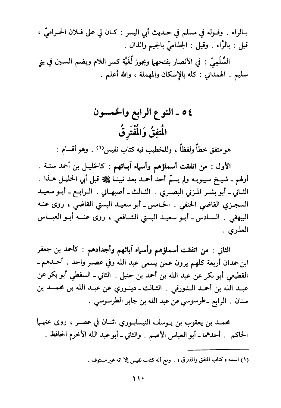 وهو متفق خطاً ولفظاً وللخطيب فيه كتاب نفيس وهو أقسام: الأول: اتفقت أسمائهم وأسماء آبائهم كالخليل بن أحمد ستة. أولهم: شيخ سيبويه ولم يسم أحد أحمد بعد نبينا صلى الله عليه وسلم قبل أبي خليل هذا. والثاني: أبو بشير المزني البصري. الثالث: أصبهاني. الرابع: أبو سعيد السجزي القاضي الحنفي. الخامس: أبو سعيد البستي القاضي، روي عنه البيهقي. السادس: أبو سعيد البستي الشافعي، عنه أبو العباس العذري.
