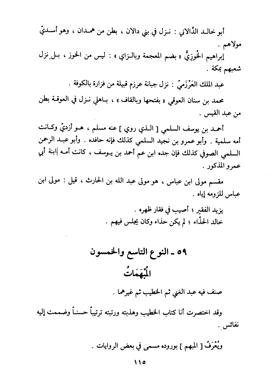 أبو خالد الدالاني نزل في بني دالان بطن من همدان وهو نزل شعبهم بمكة، عبد الملك العرزمي نزل جبانة عرزم قبيلة من فزارة بالكوفة، محمد بن سنان العوقي بفتحها وبالقاف باهلي نزل في العوقة بطن من عبد القيس، أحمد بن يوسف السلمي عند مسلم هو أزدي وكانت أمه سليمة، وأبو عمرو بن نجيد السلمي كذلك فإنه حافده، وأبو عبد الرحمن السلمي الصوفي كذلك فإن جده ابن عم أحمد بن يوسف كانت أمه بنت أبي عمرو والمذكور، مقسم مولى ابن عباس هو مولى عبد الله بن الحارث، قيل مولى ابن عباس للزومه إياه، يزيد الفقير أصيب في فقار ظهره، خالد الحذاء لم يكن حذاء وكان يجلس فيهم، والله أعلم.