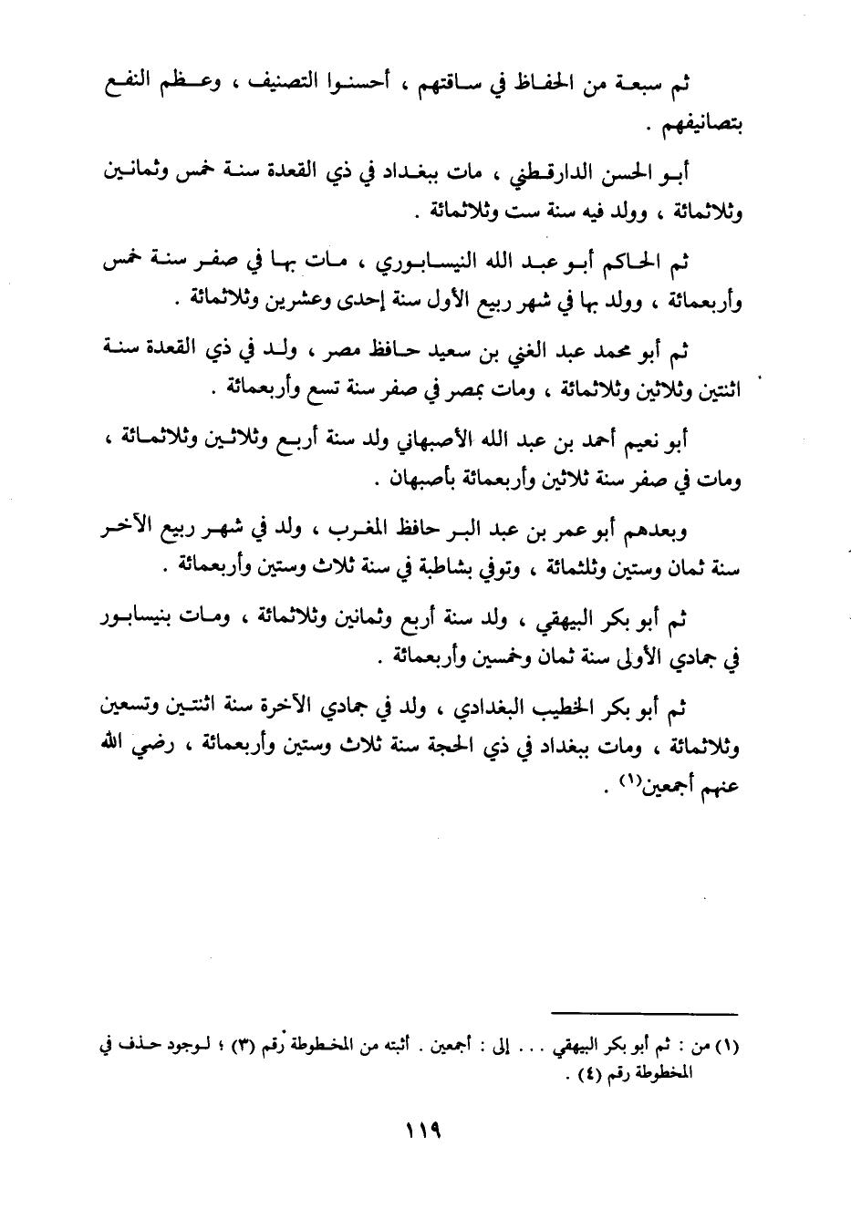 ثم سبعة من الحفاظ في ساقتهم أحسنوا التصنيف وعظم النفع بتصانيفهم: أبو الحسن الدارقطني، مات ببغداد في ذي القعدة سنة خمس وثمانين وثلثمائة وولد فيه سنة ست وثلاثمائة، ثم الحاكم أبو عبد الله النيسابوري مات في صفر سنة خمس وأربعمائة وولد بها في شهر ربيع الأول سنة إحدى وعشرين وثلاثمائة، ثم أبو محمد عبد الغني بن سعيد حافظ مصر ولد في ذي القعدة سنة اثنتين وثلاثين وثلاثمائة، ومات بمصر في صفر سنة تسع وأربعمائة، أبو نعيم أحمد بن عبد الله الأصبهاني ولد سنة أربع وثلاثين وثلاثمائة ومات في صفر سنة ثلاثين وأربعمائة بأصبهان، وبعدهم أبو عمر بن عبد البر حافظ المغرب ولد في شهر ربيع الآخر سنة ثمان وستين وثلاثمائة وتوفي في بشاطبة فيه سنة ثلاث وستين وأربعمائة، ثم أبو بكر البيهقي ولد سنة أربع وثمانين وثلاثمائة ومات بنيسابور في جمادى الأولى سنة ثمان وخمسين وأربعمائة. ثم أبو بكر الخطيب البغدادي ولد في جمادى الآخرة سنة اثنتين وتسعين وثلاثمائة ومات ببغداد في ذي الحجة سنة ثلاث وستين وأربعمائة. رضي الله عنهم أجمعين، والله أعلم.