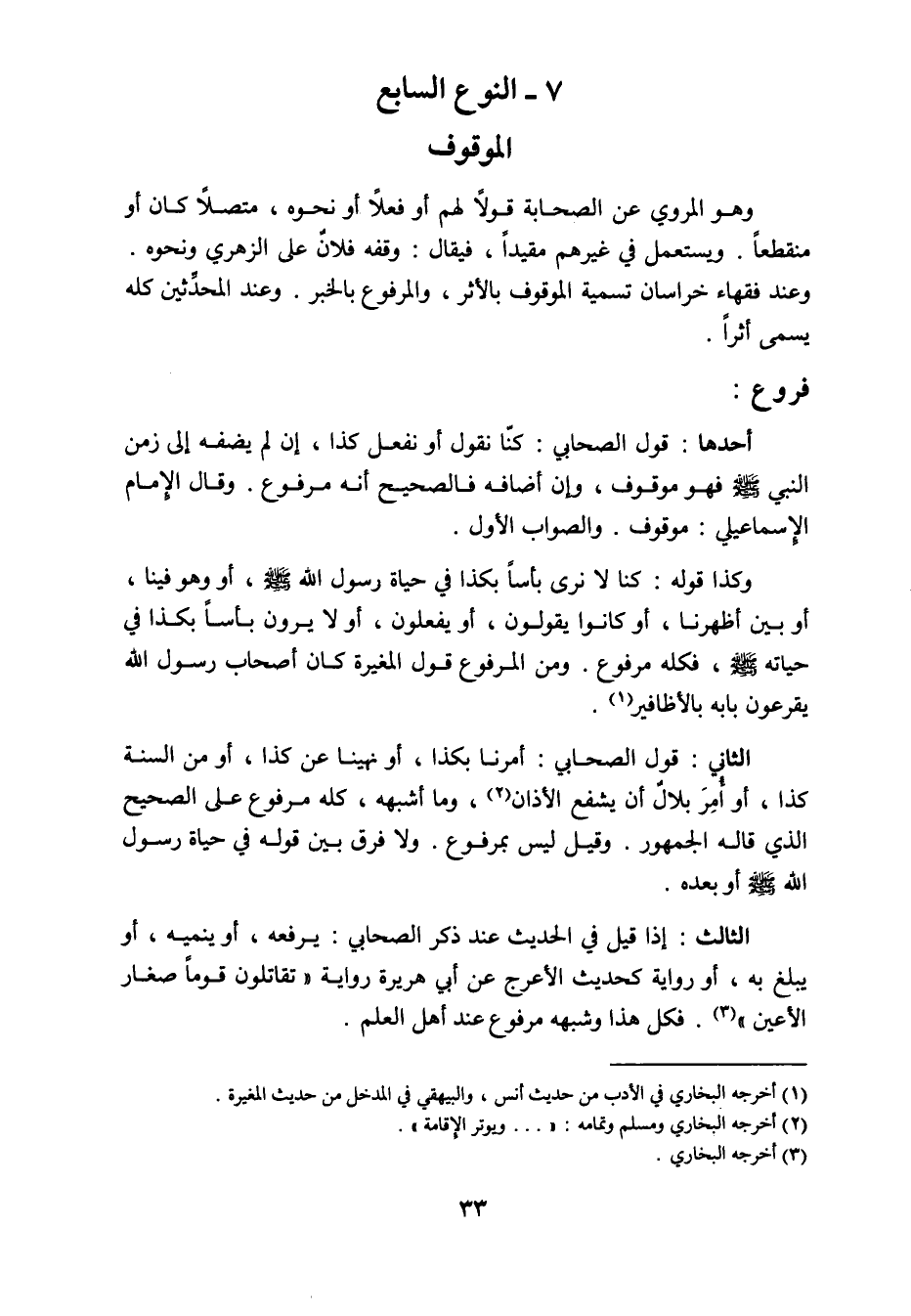 أحدها: قول الصحابي كنا نقول أو نفعل كذا. إن لم يضفه إلى زمن النبي صلى الله عليه وسلم فهو موقوف، وإن أضافه فالصحيح أنه مرفوع. وقال الإمام الإسماعيلي: موقوف. والصواب الأول، وكذا قوله: كنا لا نرى بأساً بكذا في حياة رسول الله صلى الله عليه وسلم، أو وهو فينا، أو بين أظهرنا أو كانوا يقولون، أو يفعلون، أو لا يرون بأساً بكذا في حياته صلى الله عليه وسلم فكله مرفوع، ومن المرفوع قول المغيرة: كان أصحاب رسول الله يقرعون بابه بالأظافير.