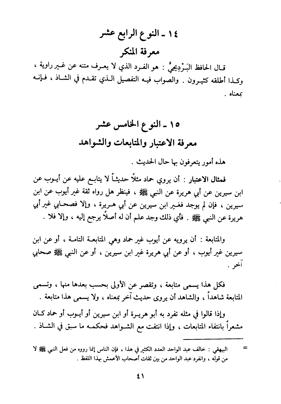 هذه أمور يتعرفون بها حال الحديث، فمثال الاعتبار: أن يروي حماد مثلاً حديثاً لا يتابع عليه عن أيوب عن ابن سيرين عن أبي هريرة عن النبي صلى الله عليه وسلم، فينظر هل رواه ثقة غير أيوب عن ابن سيرين، فإن لم يوجد فثقة غير ابن سيرين عن أبي هريرة وإلا فصحابي غير أبي هريرة عن النبي صلى الله عليه وسلم، فأي ذلك وجد علم أن له أصلاً يرجع إليه، وإلا فلا. والمتابعة أن يرويه عن أيوب غير حماد وهي المتابعة التامة، أو عن ابن سيرين غير أيوب، أو عن أبي هريرة غير ابن سيرين، أو عن النبي صلى الله عليه وسلم صحابي آخر. فكل هذا يسمى متابعة، وتقصر على الأولى بحسب بعدها منها، وتسمى المتابعة شاهداً، والشاهد أن يروى حديث آخر بمعناه، وى يسمى هذا متابعة، وإذا قالوا في مثله تفرد به أبو هريرة أو ابن سيرين أو أيوب أو حماد كان مشعراً بانتفاء المتابعات، وإذا انتفت مع الشواهد فحكمه ما سبق في الشاذ،