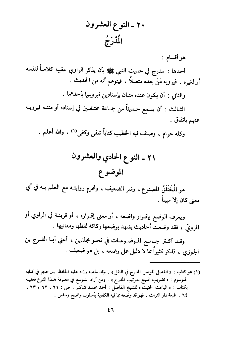 هو المختلق المصنوع وشر الضعيف، ويحرم روايته مع العلم به في أي معنى كان إلا مبيناً، ويعرف الوضع بإقرار واضعه أو معنى إقراره، أو قرينة في الراوي أو المروي، فقد وضعت أحاديث يشهد بوضعها ركاكة لفظها ومعانيها، وقد أكثر جامع الموضوعات في نحو مجلدين، أعني أبا الفرج بن الجوزي، فذكر كثيراً مما لا دليل على وضعه، بل هو ضعيف