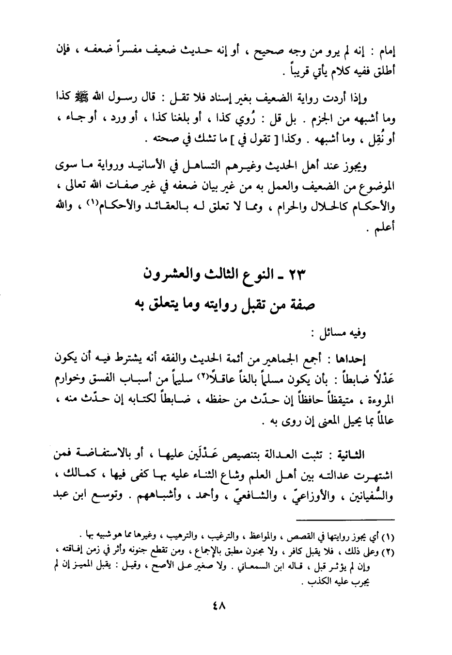 إحداها: أجمع المشاهير من أئمة الحديث والفقه أنه يشترط فيه أن يكون عدلاً ضابطاً بأن يكون مسلماً بالغاً عاقلاً سليماً من أسباب الفسق وخوارم المروءة متيقظاً، حافظاً إن حدث من حفظه، ضابطاً لكتابه إن حدث منه، عالماً بما يخيل المعنى إن روى به.