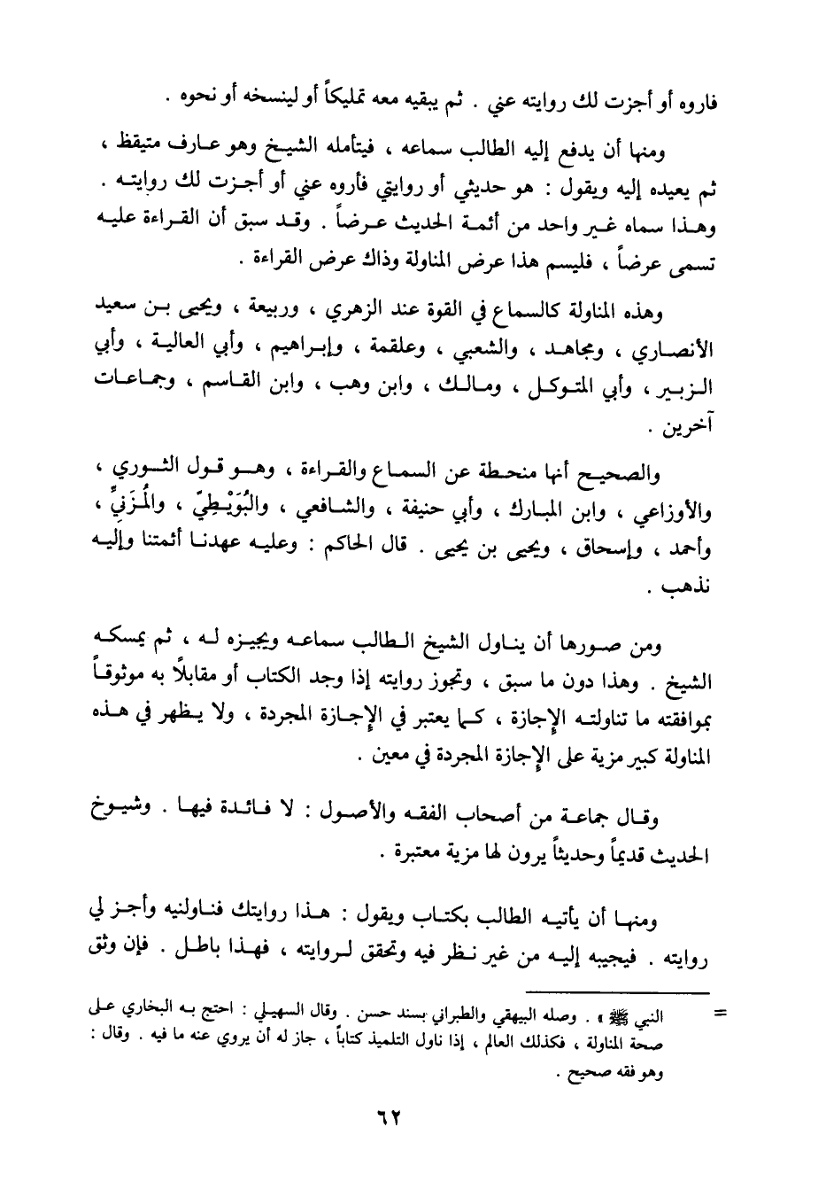 فاروه أو أجزت لك روايته عني، ثم يبقيه معه تمليكاً أو لينسخه أو نحوه، ومنها أن يدفع إليه الطالب سماعه فيتأمله وهو عارف متيقظ ثم يعيده إليه ويقول: هو حديثي أو روايتي فاروه عني أو أجزت لك روايته، وهذا سماه غير واحد من أئمة الحديث عرضاً، وقد سبق أن القراءة عليه تسمى عرضاً فليسمّ هذا عرض المناولة وذاك عرض القراءة، وهذه المناولة كالسماع في القوة عند الزهري، وربيعة، ويحيى بن سعيد الأنصاري، ومجاهد، والشعبي، وعلقمة، وإبراهيم، وأبي العالية، وأبي الزبير، وأبي التوكل، ومالك، وابن وهب، وابن القاسم، وجماعات آخرين، والصحيح أنها منحطة عن السماع والقراءة، وهو قول الثوري، والأوزاعي، وابن المبارك، وأبي حنيفة، والشافعي، البويطي، والمزني، وأحمد، وإسحاق، ويحيى بن يحيى. قال الحاكم: وعليه عهدنا أئمتنا وإليه نذهب، والله أعلم. ومن صورها أن يناول الشيخ الطالب سماعه ويجيزه له ثم يمسكه الشيخ، وهذا دون ما سبق، ويجوز روايته إذا وجد الكتاب أو مقابلاً به موثوقاً بموافقته ما تناولته الإجازة كما يعتبر في الإجازة المجردة، ولا يظهر في هذه المناولة كبير مزية على الإجازة في معين، وقال جماعة من أصحاب الفقه والأصول: لا فائدة فيها، وشيوخ الحديث قديماً وحديثاً يرون لها مزية معتبرة، ومنها أن يأتيه الطالب بكتاب ويقول: هذا روايتك فناولنيه وأجزلي روايته فيجيبه إليه من غير نظر فيه وتحقق لروايته فهذا باطل، فإن وثق