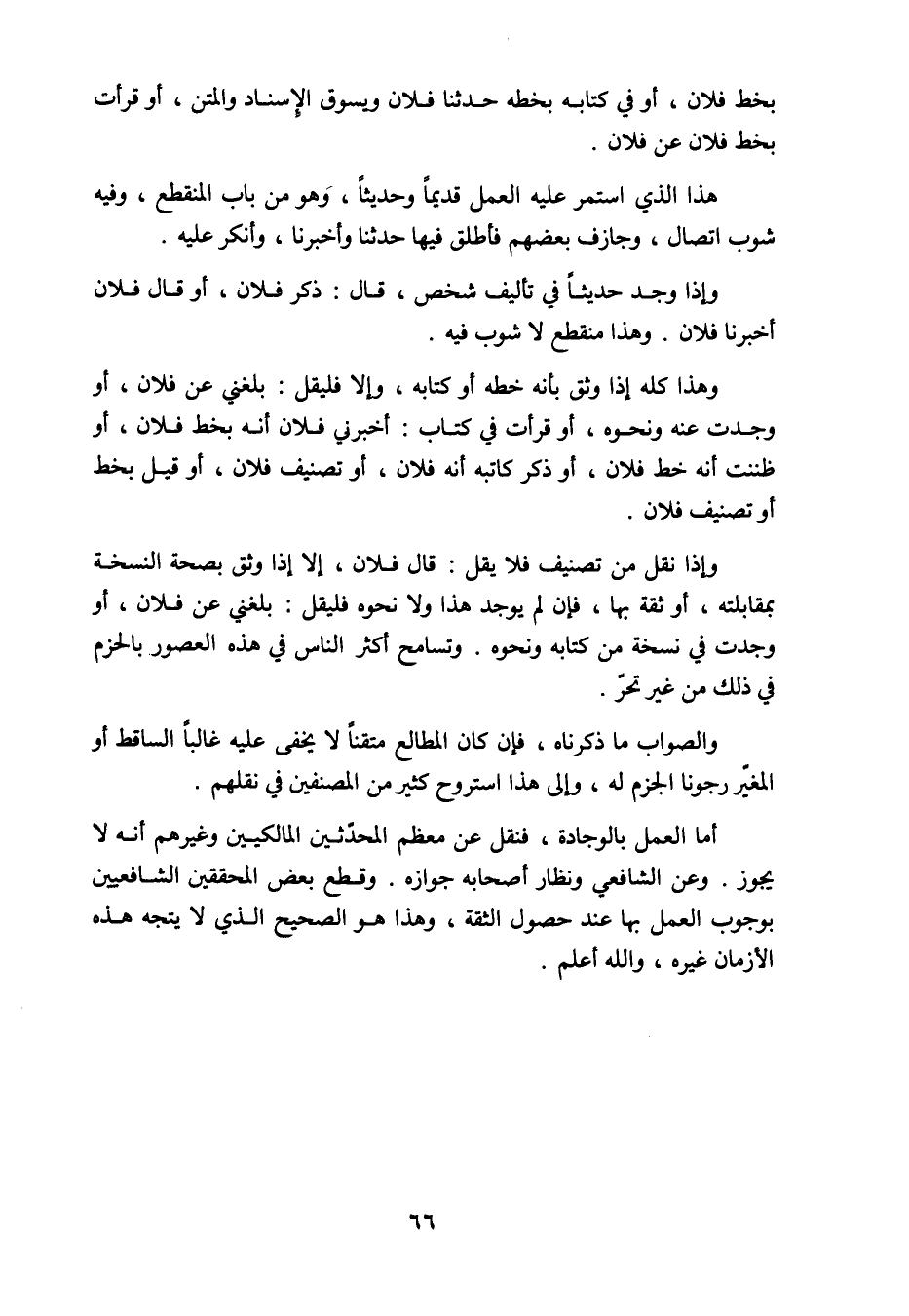 بخط فلان أو في كتابه بخطه حدثنا فلان ويسوق الإسناد والمتن، أو قرأت بخط فلان عن فلان، هذا الذي استمر عليه العمل قديماً وحديثاً، وهو من باب المنقطع، وفيه شوب إتصال، وجازف بعضهم فأطلق فيها حدثنا وأخبرنا، وأنكر عليه، وإذا وجد حديثاً في تأليف شخص، قال ذكر فلان أو قال أخبرنا فلان وهذا منقطع لا شوب فيه، وهذا كله إذا وثق بأنه خطه وكتابه، وإلا فليقل: بلغني عن فلان أو وجدت عنه ونحوه أو قرأت في كتاب: أخبرني فلان إنه بخط فلان، أو ظننت أنه خط فلان، أو ذكر كتابه أنه فلان، أو تصنيف فلان، أو قيل: بخط أو تصنيف فلان، وإذا نقل من تصنيف فلا يقل: قال فلان إلا إذا وثق بصحة النسخة بمقابلته أو ثقة لها، فإن لم يوجد هذا ولا نحوه فليقل: بلغني عن فلان، أو وجدت في نسخة من كتابه ونحوه، وتسامح أكثر الناس في هذه الأعصار بالجزم في ذلك من غير تحر، والصواب ما ذكرناه، فإن كان المطالع متقناً لا يخفى عليه غالباً الساقط والمغير رجونا جوازاً الجزم له، وإلا هذا استروح كثير من المصنفين في نقلهم، وأما العمل بالوجادة فنقل عن معظم المحدثين والفقهاء المالكيين، وغيرهم أنه لا يجوز، وعن الشافعي ونظار أصحابه جوازه وقطع بعض المحققين الشافعيين بوجوب العمل بها عند حصول الثقة، وهذا هو الصحيح الذي لا يتجه هذه الأزمان غيره والله أعلم.
