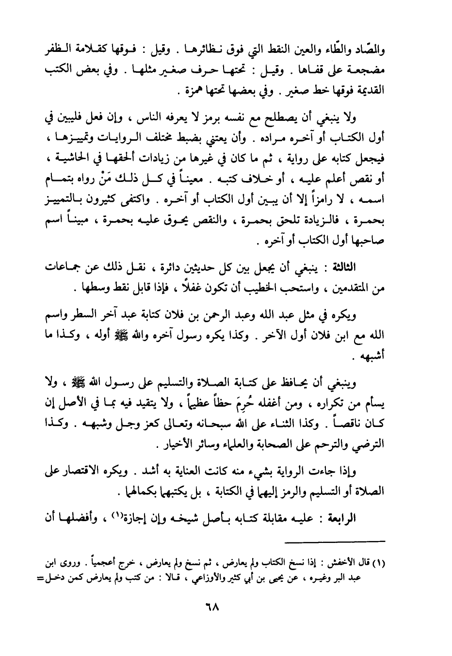 والصاد، والطاء، والعين، النقط التي فوق نظائرها، وقيل فوقها كقلامة الظفر مضطجعة على قفاها، وقيل تحتها حرف صغير مثلها، وفي بعض الكتب القديمة فوقها خط صغير، وفي بعضها تحتها همزة، ولا ينبغي أن يصطلح مع نفسه برمز لا يعرفه الناس، فإن فعل فليبين في أول الكتاب أو آخره مراده، وينبغي أن يعتني بضبط مختلف الروايات وتمييزها، فيجعل كتابه على رواية، ثم ما كان في غيرها من زيادة ألحقها في الحاشية، أو نقص أعلم عليه، أو خلاف كتبه معيناً في كل ذلك من رواه بتمام اسمه لا رامزاً إلا أن يبين أول الكتاب أو آخره، واكتفى كثيرون بالتمييز بحمرة فالزيادة تلحق بحمرة والنقص يحوِّق عليه بحمرة مبيناً اسم صاحبها أول الكتاب أو آخره.