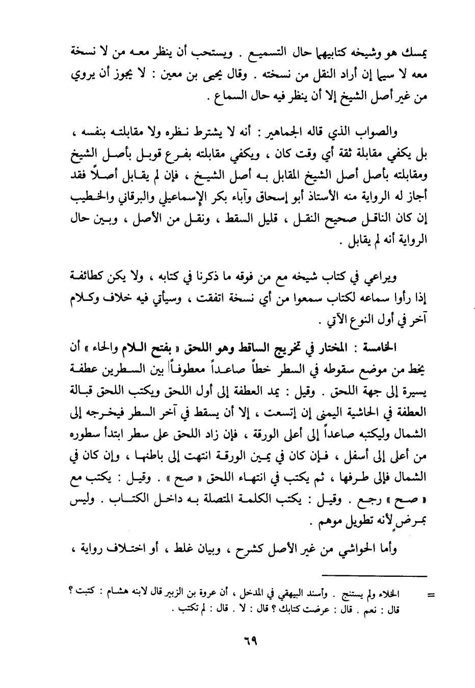 يمسك هو وشيخه كتابيهما حال التسميع، ويستحب أن ينظر معه من لا نسخة معه لا سيما إن أراد النقل من نسخته، وقال يحيى ابن معين: لا يجوز أن يروي من غير أصل الشيخ إلا أن ينظر فيه حال السماع، والصواب الذي قاله الجماهير أنه لا يشترط نظره ولا مقابلته بنفسه بل يكفي مقابلة ثقة أي وقت كان، ويكفي مقابلته بفرع قوبل بأصل الشيخ ومقابلته بأصل أصل الشيخ المقابل به اصل الشيخ، وإن لم يقابل أصىً فقد أجاز الرواية منه الأستاذ أبو إسحاق، وآباء بكر الإسماعيلي، والبرقاني، والخطيب إن كان الناقل صحيح النقل، قليل السقط، ونقل من الأصل، وبين حال الرواية أنه لم يقابل، ويراعي في كتاب شيخه مع من فوقه ما ذكرنا في كتابه، ولا يكن كطائفة إذا رأوا سماعه لكتاب سمعوه من أي نسخة اتفقت، وسيأتي فيه خلاف وكلام آخر في أول النوع الآتي.