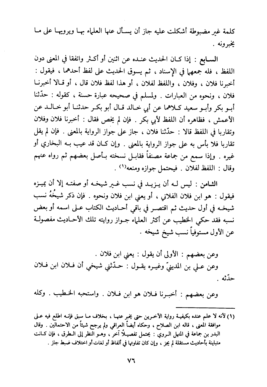 الثامن: ليس له أن يزيد في نسب غير شيخه أو صفته إلا أن يميزه فيقول: هو ابن فلان، الفلاني، أو يعني ابن فلان ونحوه. فإن ذكر شيخه نسب شيخه في أول حديث ثم اقتصر في باقي أحاديث الكتاب على اسمه أو بعض نسبه فقد حكى الخطيب عن أكثر العلماء جواز روايته تلك الأحاديث مفصولة عن الأول مستوفياً نسب شيخ شيخه، وعن بعضهم: الأولى أن يقول: يعني ابن فلان، وعن علي بن المديني وغيره يقول: حدثني شيخي أن فلان ابن فلان حدثه، وعن بعضهم أخبرنا فلان هو ابن فلان واستحبه الخطيب وكله