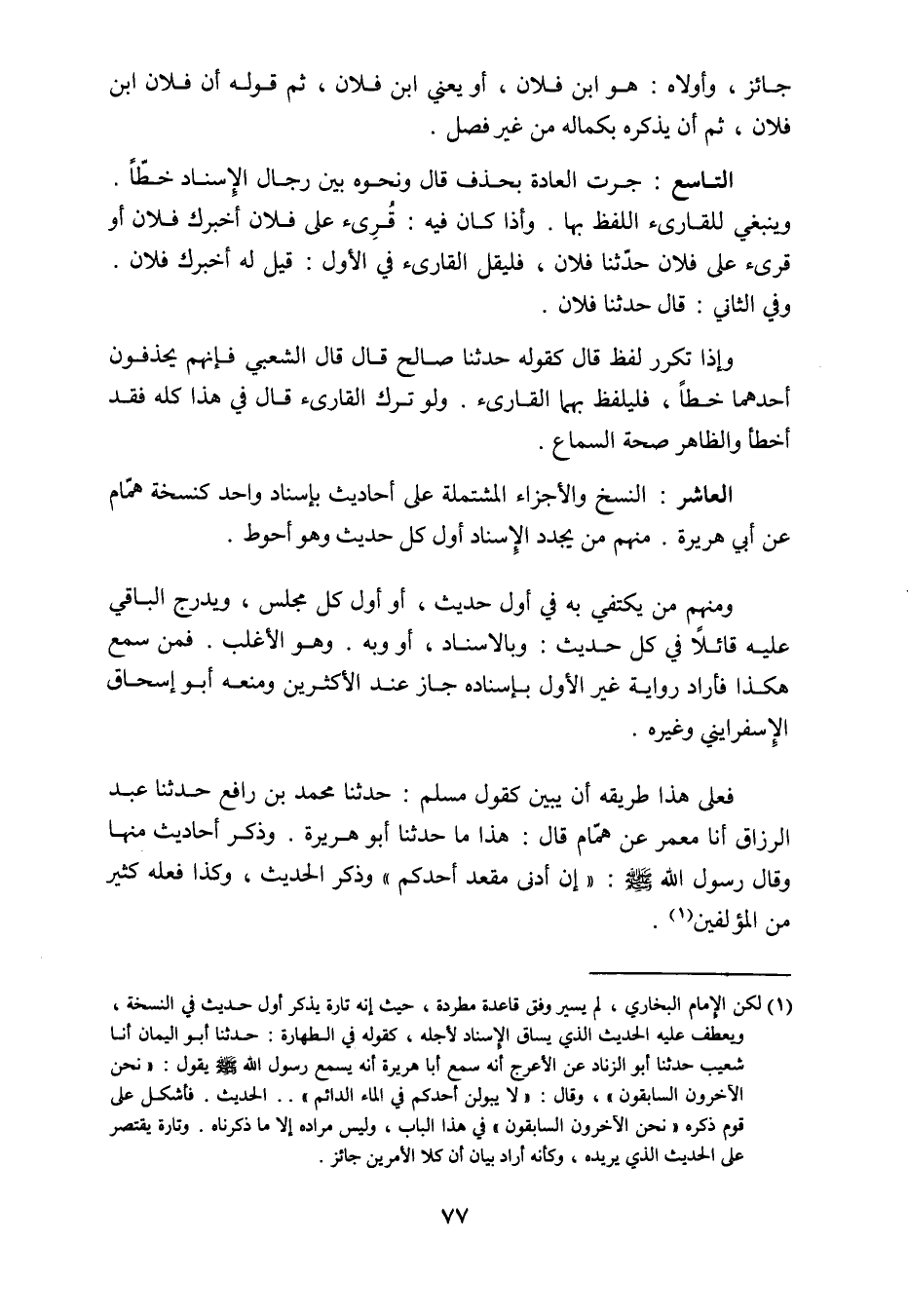 العاشر: النسخ والأجزاء المشتملة على أحاديث بإسناد واحد كنسخة همام عن أبي هريرة منهم من يجدد الإسناد أول كل حديث وهو أحوط، ومنهم من يكتفي به في أول حديث، أو أول كل مجلس ويدرج الباقي عليه قائلاً في كل حديث وبالإسناد أو وبه، وهو الأغلب. فمن سمع هكذا فأراد رواية غير الأول بإسناد جاز عند الأكثرين، ومنعه أبو إسحاق الإسفراييني وغيره، فعلى هذا طريقه أن يبين كقول مسلم: حدثنا محمد بن رافع حدثنا عبد الرزاق أنا معمر عن همام قال هذا ما حدثنا أبو هريرة، وذكر أحاديث منها وقال رسول الله صلى الله عليه وسلم: " إن أدنى مقعد أحدكم " وذكر الحديث وكذا فعله كثير من المؤلفين،