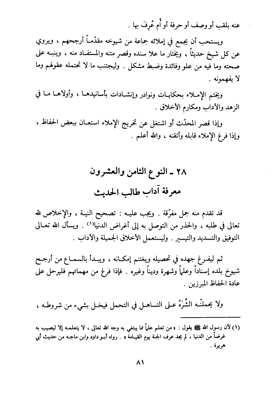 عند بلقب أو وصف أو حرفة أو أم عرف بها، ويستحب أن يجمع في إملائه جماعة من شيوخه مقدماً أرجحهم، ويروي عن كل شيخ حديثاً ويختار ما علا سنده وقصر متنه، والمستفاد منه، وينبه على صحته وما فيه من علو، وفائدة، وضبط مشكل، وليتجنب ما لا تحتمله عقولهم وما لا يفهمونه، ويختم الإملاء بحكايات ونوادر وإنشادات بأسانيدها، وأولاها ما في الزهد، والآداب، ومكارم الأخلاق، وإذا قصر المحدث أو اشتغل عن التخريج للإملاء استعان ببعض الحفاظ، وإذا فرغ الإملاء قابله وأتقنه، والله أعلم.