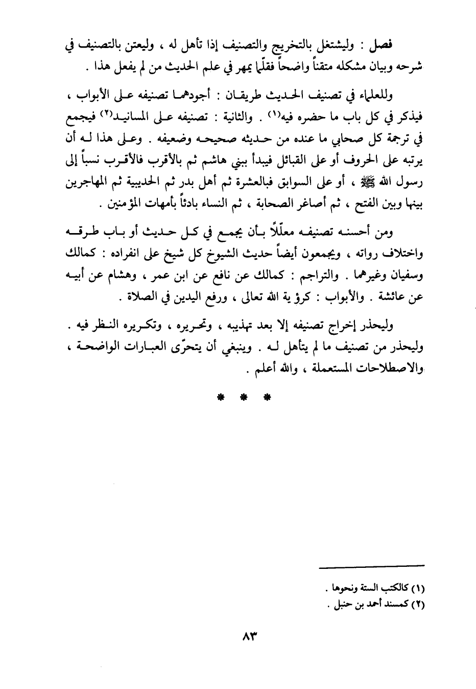 وليشتغل بالتخريج والتصنيف إذا تأهل له، وليعتن بالتصنيف في شرحه وبيان مشكله متقناً واضحاً فقلما يمهر في علم الحديث من لم يفعل هذا، وللعلماء في تصنيف الحديث طريقان: أجودهما تصنيفه على الأبواب فيذكر في كل باب ما حضره فيه، والثانية تصنيفه على المسانيد فيجمع في ترجمة كل صحابي ما عنده من حديثه صحيحه وضعيفه، وعلى هذا له أن يرتبه على الحروف أو على القبائل فيبدأ ببني هاشم ثم بالأقرب فالأقرب نسباً إلى رسول الله صلى الله عليه وسلم، أو على السوابق، فبالعشرة، ثم أهل بدر، ثم الحديبية، ثم المهاجرين بينها وبين الفتح، ثم أصاغر الصحابة، ثم النساء بادئاً بأمهات المؤمنين، ومن أحسنه تصنيفه معللاً، بأن يجمع في كل حديث أو باب طرقه واختلاف رواته، ويجمعون أيضاً حديث كل شيخ على انفراده: كمالك وسفيان وغيرهما، والتراجم: كمالك عن نافع عن ابن عمر، والمساواة عن أبيه عن عائشة، والأبواب: كرؤية الله تعالى ورفع اليدين في الصلاة. وليحذر إخراج تصنيفه إلا بعد تهذيبه وتحريره وتكرير النظر فيه، وليحذر من تصنيف ما لم يتأهل له، وينبغي أن يتحرى العبارات الواضحة، والاصطلاحات المستعملة، والله أعلم.