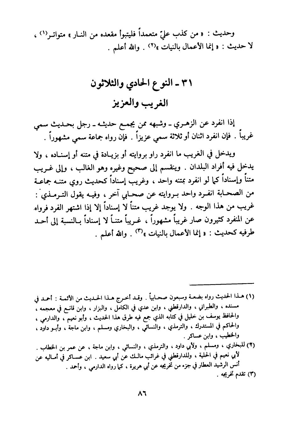 إذا انفرد عن الزهري وشبهه ممن يجمع حديثه رجل بحديث سمي غريبا، فإن انفرد اثنان أو ثلاثة سمي عزيزاً فإن رواه الجماعة سمي مشهورا، ويدخل في الغريب ما انفرد راو بروايته أو بزيادة في متنه أو إسناده، ولا يدخل فيه أفراد البلدان وينقسم إلى صحيح وغيره وهو الغالب، وإلى غريب متناً وإسناداً كما لو انفرد بمتنه واحد، وغريب إسناداً كحديث روي متنه جماعة من الصحابة انفرد واحد بروايته عن صحابي آخر، وفيه يقول الترمذي: غريب من هذا الوجه، ولا يوجد غريب متناً ولا إسناداً إلا إذا اشتهر الفرد فرواه عن المنفرد كثيرون صار غريباً مشهوراً، غريباً متناً لا إسناداً بالنسبة إلى أحد طرفيه كحديث " إنما الأعمال بالنيات " والله أعلم.