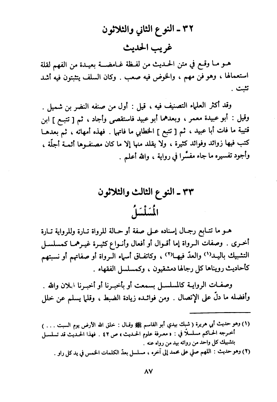 هو ما تتابع رجال إسناده على صفة أو حالة للرواة تارة وللرواية تارة، وصفات الروات أقوال وأفعال وأنواع كثيرة غيرها كمسلسل التشبيك باليد والعد فيها، وكاتفاق أسماء الرواة أو صفاتهم أو نسبتهم كأحاديث رويناها كل رجال دمشقيون، وكمسلسل الفقهاء، وصفاة الرواية كالمسلسل بسمعت، أو بأخبرنا، أو أخبرنا فلان والله، وأفضله ما دل على الاتصال، ومن فوائده زيادة الضبط، وقلما يسلم عن خلل