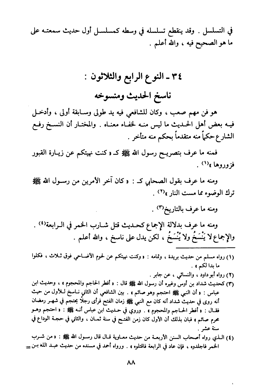 هو فن مهم صعب وكان للشافعي رحمة الله فيه يد طولى، وسابقة أولى، وأدخل فيه بعضهم بعض أهل الحديث ما ليس منه لخفاء معناه والمختار أن النسخ رفع الشارع حكما منه متقدماً بحكم منه متأخر، فمنه ما عرف بتصريح رسول الله صلى الله عليه وسلم " ككان آخر الأمرين من رسول الله صلى الله عليه وسلم ترك الوضوء مما مست النار " ومنه ما عرف بالتاريخ، ومنه ماعرف بدلالة الاجماع كحديث قتل شارب الخمر في الرابعة والاجماع لا يَنسَخ ولا يُنسخ لكن يدل على ناسخ والله أعلم.