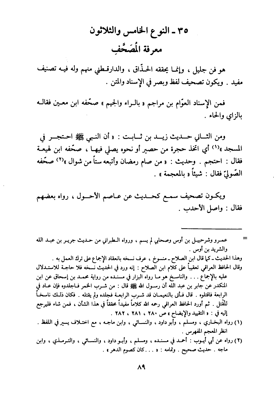 هو فن جليل إنما يحققه الحذاق، والدارقطني منهم وله فيه تصنيف مفيد ويكون تصحيف لفظ وبصر في الإسناد والمتن فمن الإسناد العوام بن مراجم " بالراء والجيم "، صحفه ابن معين فقال بالزاي والحاء، ومن الثاني حديث زيد بن ثابت: " أن النبي صلى الله عليه وسلم احتجر في المسجد " أي اتخذ حجرة من حصير أو نحوه يصلي فيها، صحفه ابن لهيعة فقال: احتجم، وحديث " من صام رمضان وأتبعه ستاً من شوال " صحفه الصولي فقال: شيئا بالمعجمة، ويكون تصحيف سمع كحديث عن عاصم الأحوال، رواه بعضهم فقال: واصل الأحدب،