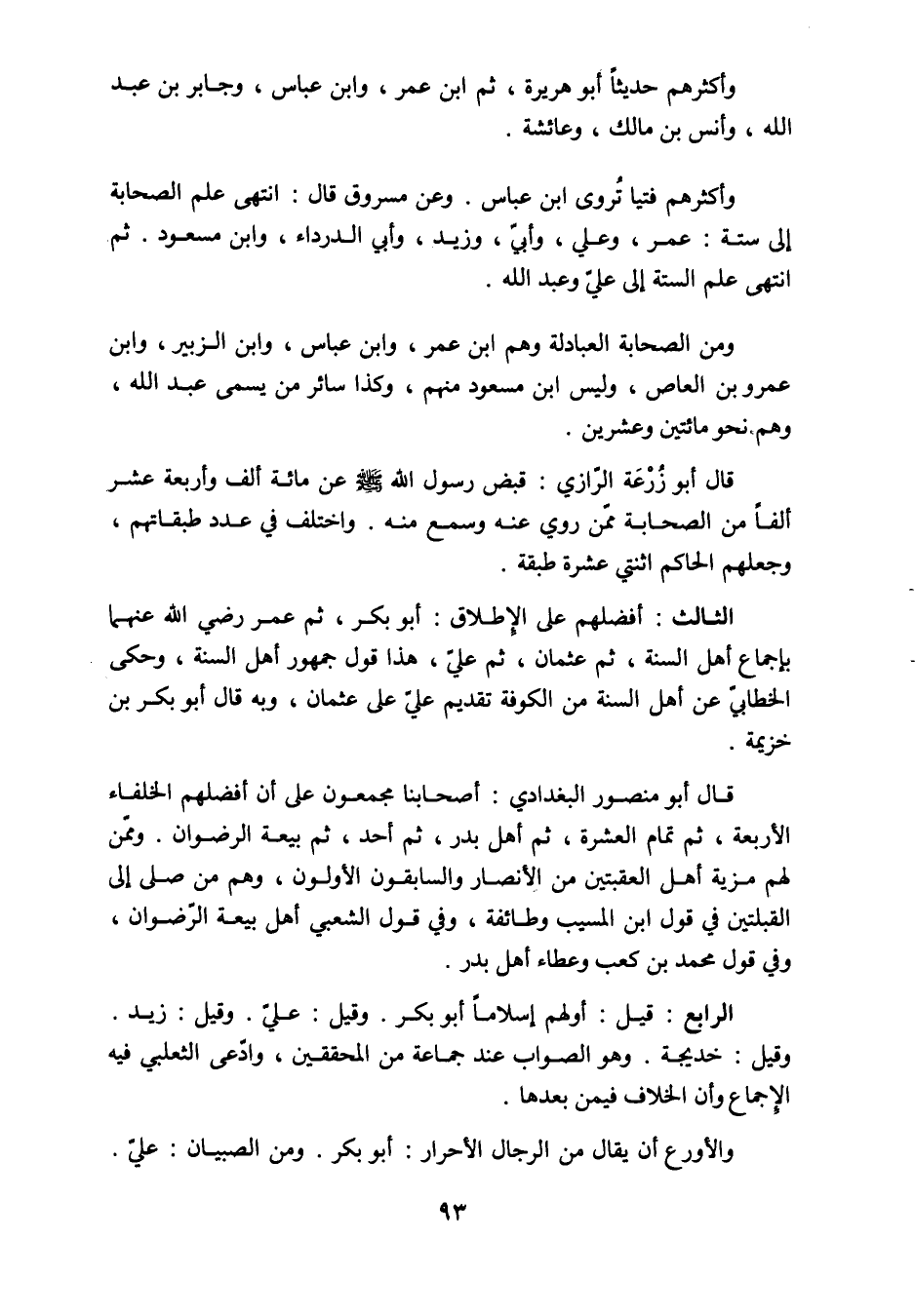 وأكثرهم حديثاً: أبو هريرة، ثم ابن عمر، وابن عباس، وجابر بن عبد الله، وأنس، وعائشة، وأكثرهم فتياً تروى: ابن عباس. وعن مسروق قال: انتهى علم الصحابة إلى ستة: عمر، وعلي، وأبي، وزيد، أبي الدرداء، وابن مسعود. ثم انتهى علم الستة إلى علي، وعبد الله، ومن الصحابة العبادلة، وهم ابن عمر، وابن عباس، ابن الزبير، ابن عمر بن العاص، وليس ابن مسعود منهم، وكذا سائر من يسمى عبد الله، وهم نحو مائتين وعشرين. قال أبو زرعة الرازي: قبض رسول الله صلى الله عليه وسلم عن مائة ألف وأربعة عشر ألفاً من الصحابة ممن روي عنه وسمع منه، واختلف في عدد طبقاتهم، وجعلهم الحاكم اثنتي عشرة طبقة، والله أعلم.