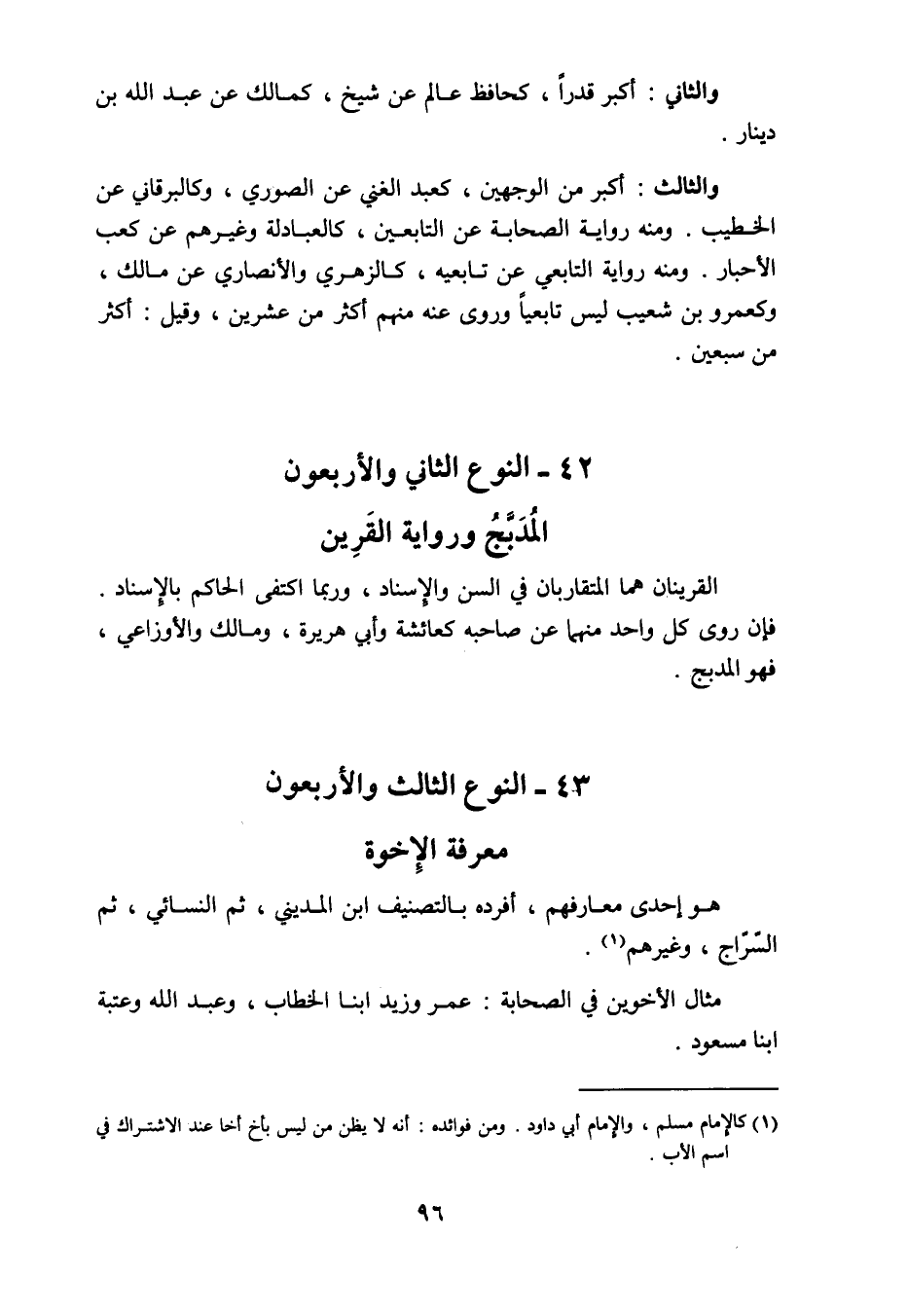 والثاني: أكبر قدراً، كحافظ عالم عن شيخ، كمالك عن عبد الله بن دينار، والثالث أكبر من الوجهين كعبد الغني عن الصوري، وكالبرقاني عن الخطيب ومنه رواية الصحابة عن التابعين كالعبادلة وغيرهم عن كعب الأحبار، ومنه رواية التابعي عن تابعه كالزهري، والأنصاري عن مالك وكعمرو بن شعيب ليس تابعياً، وروى عنه منهم أكثر من عشرين وقيل أكثر من سبعين، والله أعلم.