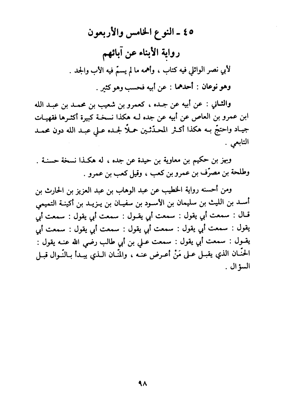 لأبي نصر الوائلي فيه كتاب وأهمه ما لم يسم فيه الأب أو الجد، وهو نوعان: أحدها عن أبيه فحسب، وهو كثير. والثاني: عن أبيه عن جده كعمرو بن شعيب بن محمد بن عبد الله بن عمرو بن العاص عن أبيه عن جده له. هكذا نسخة كبيرة أكثرها فقيهات جياد، واحتج به هكذا أكثر المحدثين حملا لجده على عبد الله دون محمد التابعي. وبهز بن حكيم بن معاوية بن حيدة عن أبيه عن جده له هكذا نسخة حسنة وطلحة بن مصرف بن عمرو بن كعب، وقيل كعب بن عمرو، ومن أحسنه رواية الخطيب عن عبد الوهاب بن عبد العزيز بن الحارث بن أسد بن الليث بن سليمان بن الأسود بن سفيان بن زيد بن أكينة التميمي قال: سمعت أبي يقول سمعت أبي يقول سمعت أبي يقول سمعت أبي يقول سمعت أبي يقول سمعت أبي يقول سمعت أبي يقول سمعت أبي يقول سمعت علي بن أبي طالب رضي الله عنه: يقول: " الحنان الذي يقبل على من أعرض عنه والمنان الذي يبدأ بالنوال قبل السؤال " والله أعلم.